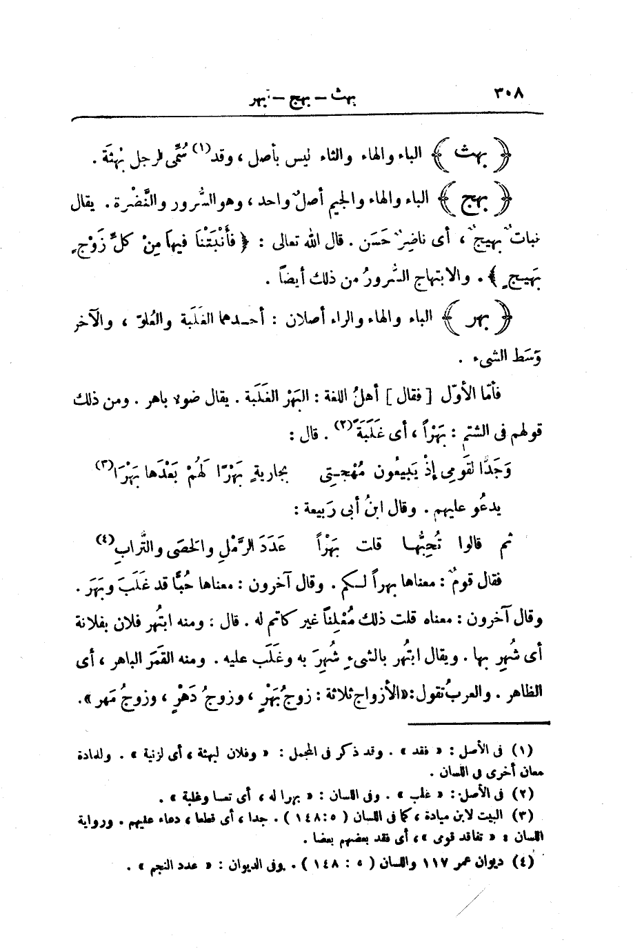(بَهَرَ) الْبَاءُ وَالْهَاءُ وَالرَّاءُ أَصْلَانِ: أَحَدُهُمَا الْغَلَبَةُ وَالْعُلُوُّ، وَالْآخَرُ وَسَطُ شَّيْءِ.