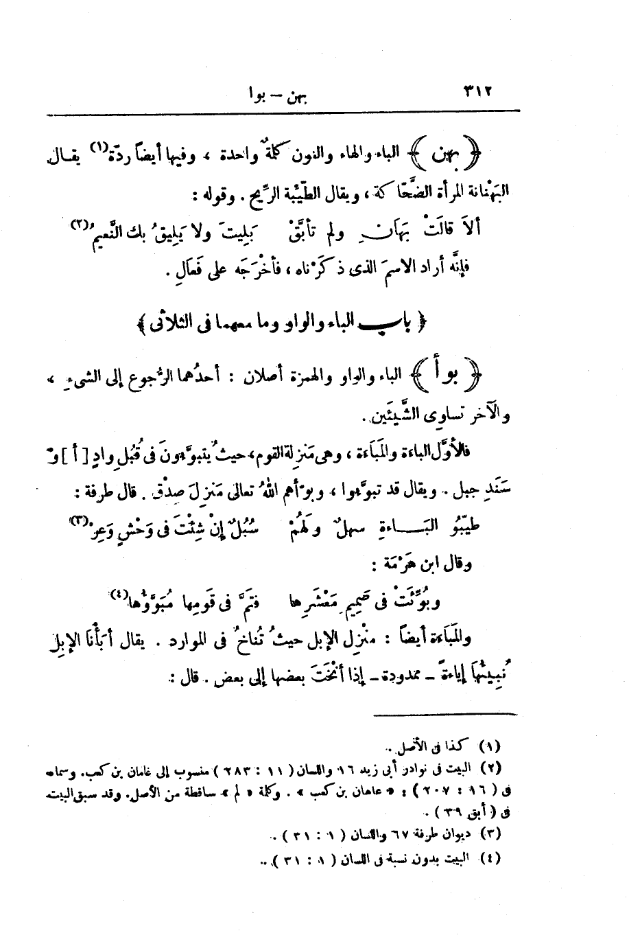 فَالْأَوَّلُ الْبَاءَةُ وَالْمَبَاءَةُ، وَهِيَ مَنْزِلَةُ الْقَوْمِ، حَيْثُ يَتَبَوَّءُونَ فِي قُبُلِ وَادٍ [أَ] وْ سَنَدِ جَبَلٍ. وَيُقَالُ قَدْ تَبَوَّءُوا، وَبَوَّأَهُمُ اللَّهُ تَعَالَى مَنْزِلَ صِدْقٍ. قَالَ طَرَفَةُ: