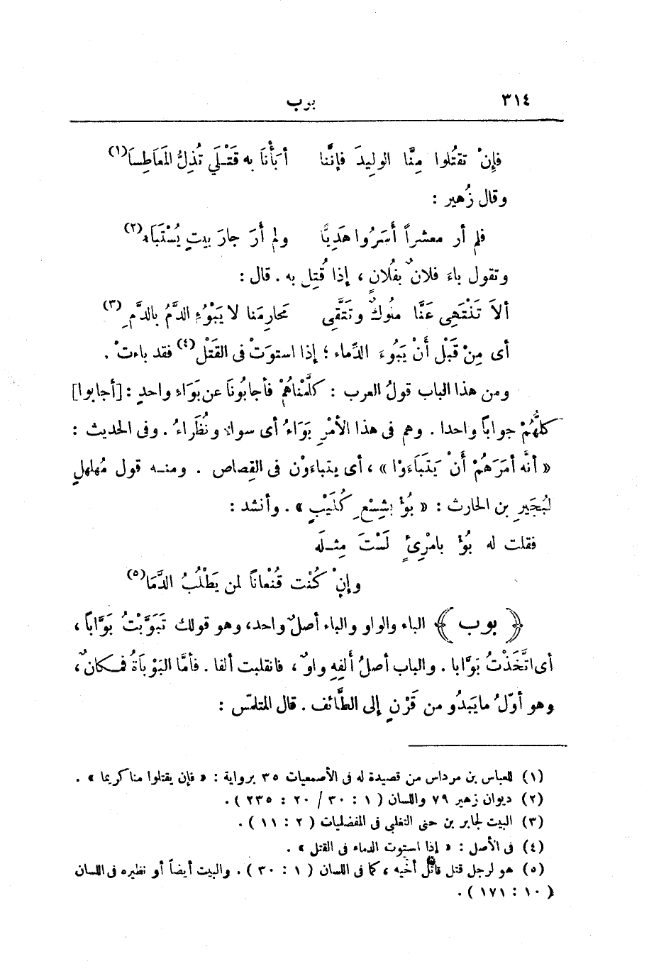 وَمِنْ هَذَا الْبَابِ قَوْلُ الْعَرَبِ: كَلَّمْنَاهُمْ فَأَجَابُونَا عَنْ بَوَاءٍ وَاحِدٍ: [أَجَابُوا] كُلُّهُمْ جَوَابًا وَاحِدًا. وَهُمْ فِي هَذَا الْأَمْرِ بَوَاءٌ أَيْ سَوَاءٌ وَنُظَرَاءُ. وَفِي الْحَدِيثِ: «أَنَّهُ أَمَرَهُمْ أَنْ يَتَبَاءَوْا» ، أَيْ يَتَبَاءَوْنَ فِي الْقِصَاصِ. وَمِنْهُ قَوْلُ مُهَلْهَلٍ لِبُجَيْرِ بْنِ الْحَارِثِ: " بُؤْ بِشِسْعِ كُلَيْبٍ ". وَأَنْشَدَ: