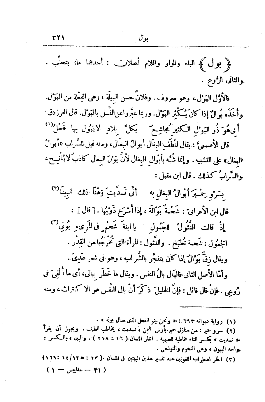 فَالْأَوَّلُ الْبَوْلُ، وَهُوَ مَعْرُوفٌ وَفُلَانٌ حَسَنُ الْبِيلَةِ، وَهِيَ الْفِعْلَةُ مِنَ الْبَوْلِ. وَأَخَذَهُ بُوَالٌ إِذَا كَانَ يُكْثِرُ الْبَوْلَ. وَرُبَّمَا عَبَّرُوا عَنِ النَّسْلِ بِالْبَوْلِ. قَالَ الْفَرَزْدَقُ: