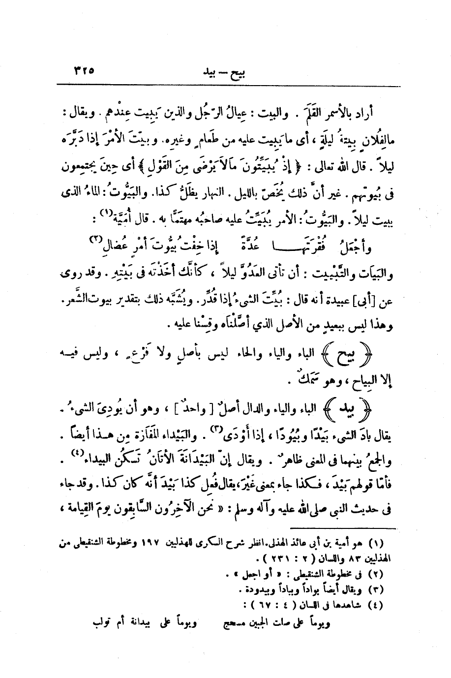 (بَيَدَ) الْبَاءُ وَالْيَاءُ وَالدَّالُ أَصْلٌ [وَاحِدٌ] ، وَهُوَ أَنْ يُودِيَ الشَّيْءُ. يُقَالُ بَادَ الشَّيْءُ بَيْدًا وَبُيُودًا، إِذَا أَوْدَى. وَالْبَيْدَاءُ الْمَفَازَةُ مِنْ هَذَا أَيْضًا. وَالْجَمْعُ بَيْنَهُمَا فِي الْمَعْنَى ظَاهِرٌ. وَيُقَالُ إِنَّ الْبَيْدَانَةَ الْأَتَانُ تَسْكُنُ الْبَيْدَاءَ. فَأَمَّا قَوْلُهُمْ بَيْدَ، فَكَذَا جَاءَ بِمَعْنَى غَيْرَ، يُقَالُ فُعِلَ كَذَا بَيْدَ أَنَّهُ كَانَ كَذَا. وَقَدْ جَاءَ فِي حَدِيثِ النَّبِيِّ صَلَّى اللَّهُ عَلَيْهِ وَآلِهِ وَسَلَّمَ: «نَحْنُ الْآخِرُونَ السَّابِقُونَ يَوْمَ الْقِيَامَةِ،