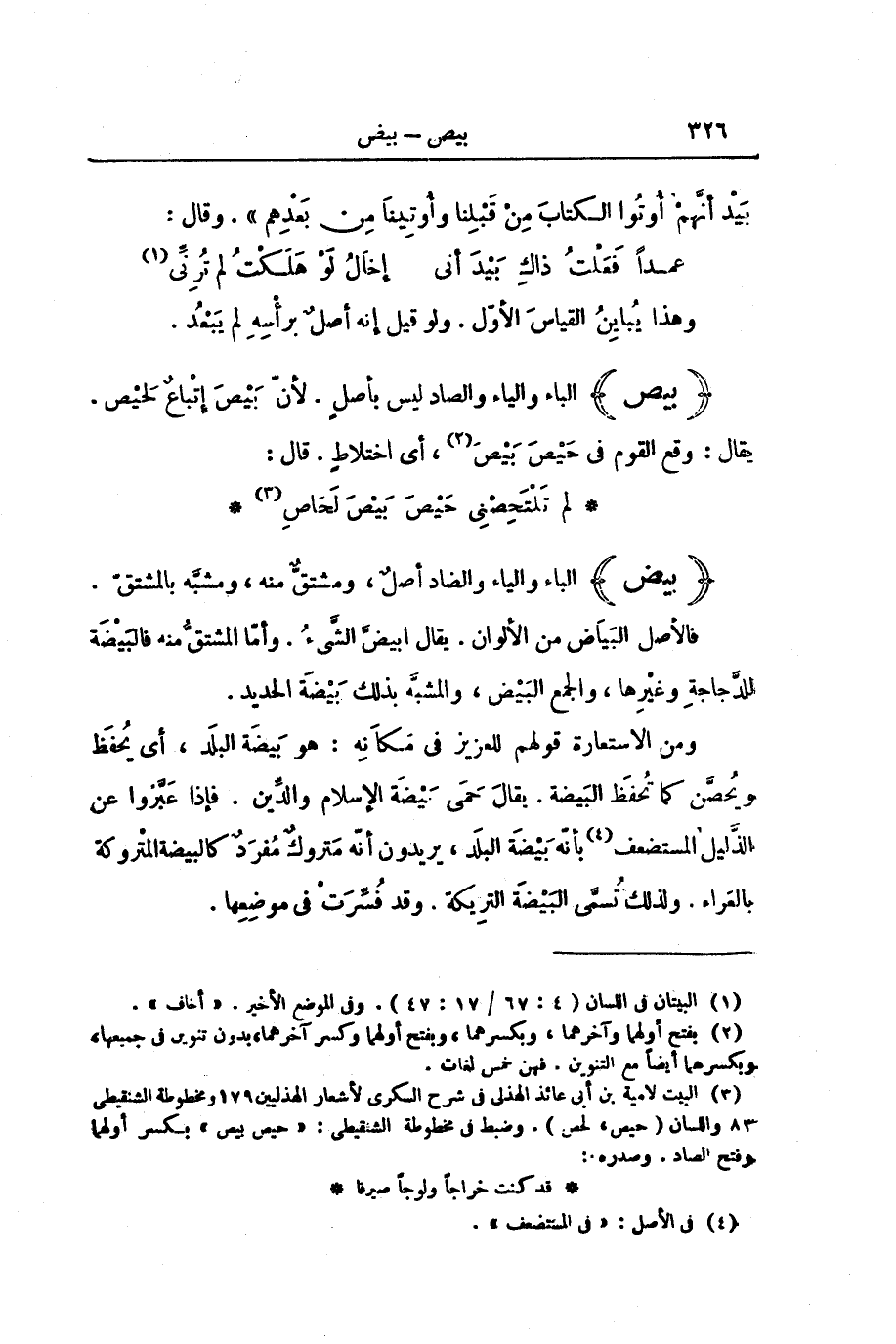 فَالْأَصْلُ الْبَيَاضُ مِنَ الْأَلْوَانِ. يُقَالُ ابْيَضَّ الشَّيْءُ. وَأَمَّا الْمُشْتَقُّ مِنْهُ فَالْبَيْضَةُ لِلدَّجَاجَةِ وَغَيْرِهَا، وَالْجَمْعُ الْبَيْضُ، وَالْمُشَبَّهُ بِذَلِكَ بَيْضَةُ الْحَدِيدِ.