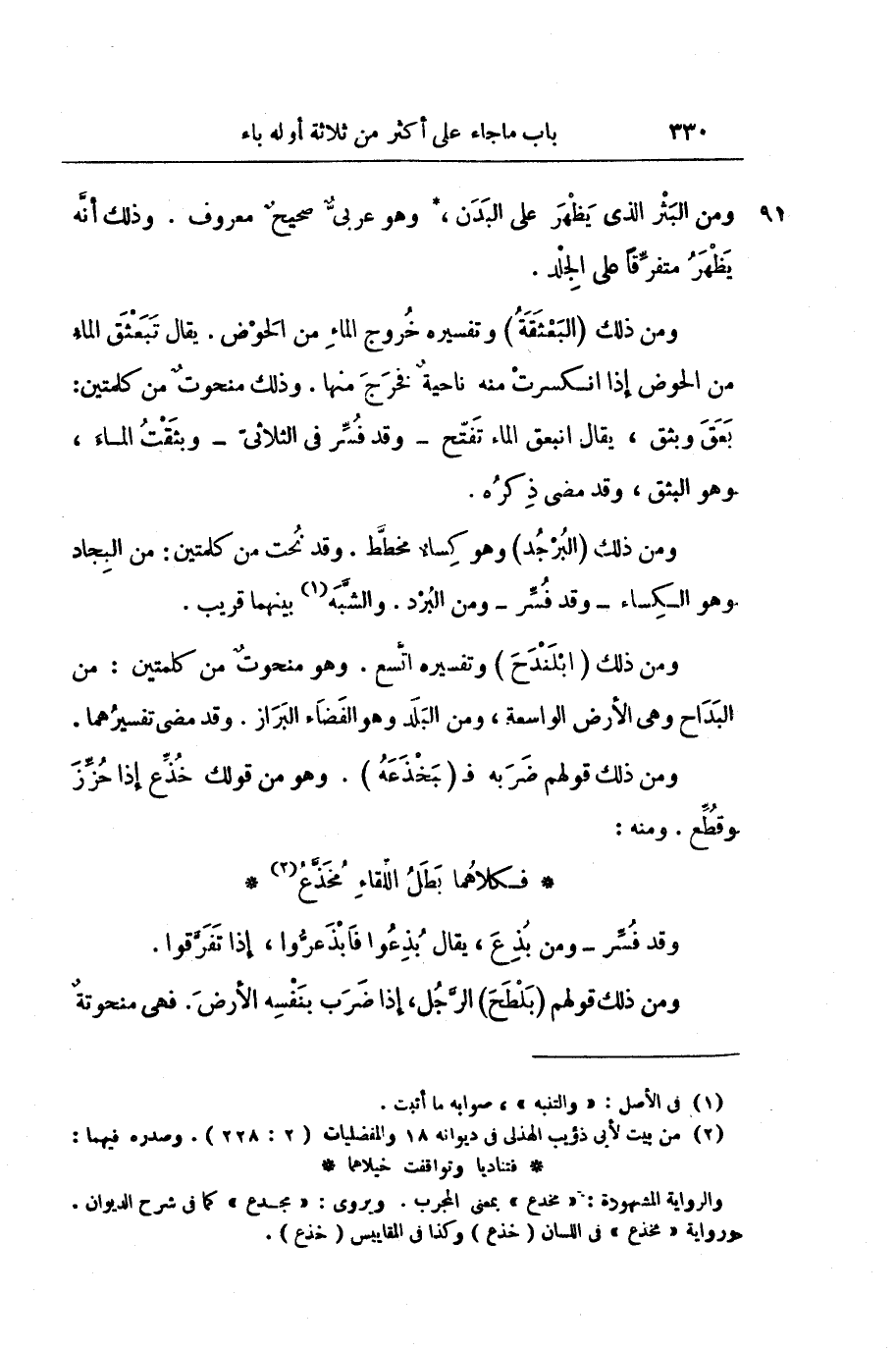 وَمِنْ ذَلِكَ قَوْلُهُمْ ضَرَبَهُ فَ (بَخْذَعَهُ) وَهُوَ مِنْ قَوْلِكَ خُذِّعَ إِذَا حُزِّزَ وَقُطِّعَ. وَمِنْهُ: