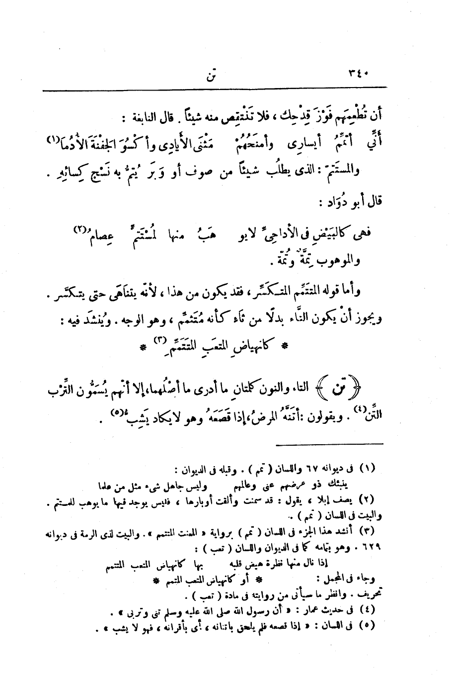 وَأَمَّا قَوْلُهُ الْمُتَتَمِّمُ الْمُتَكَسِّرُ، فَقَدْ يَكُونُ مِنْ هَذَا، لِأَنَّهُ يَتَنَاهَى حَتَّى يَتَكَسَّرَ. وَيَجُوزُ أَنْ يَكُونَ التَّاءُ بَدَلًا مِنْ ثَاءٍ كَأَنَّهُ مُتَثَمِّمٌ، وَهُوَ الْوَجْهُ. وَيُنْشَدُ فِيهِ: