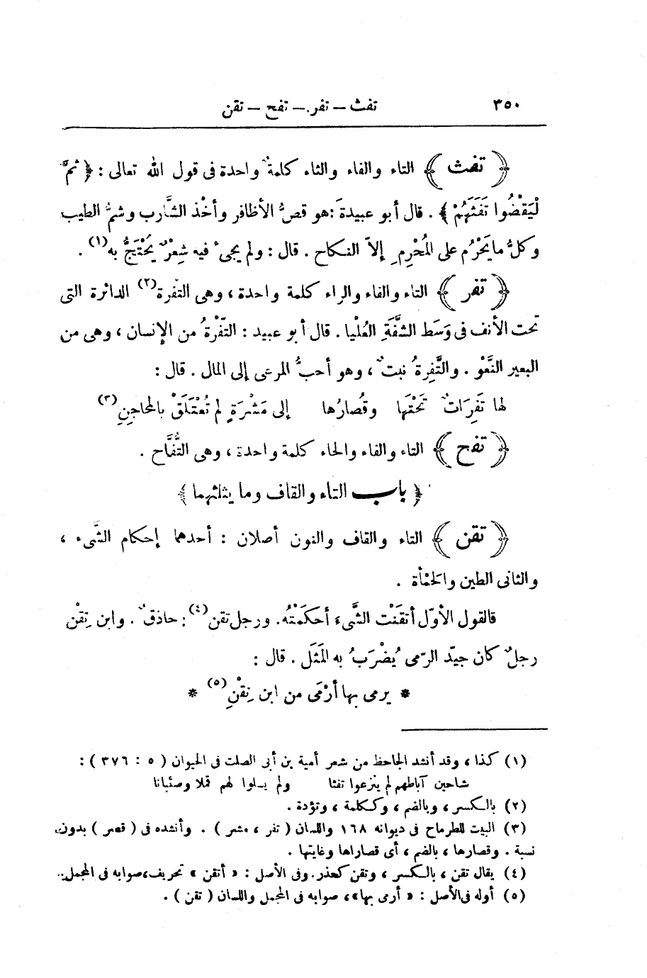 (تَفَثَ) التَّاءُ وَالْفَاءُ وَالثَّاءُ كَلِمَةٌ وَاحِدَةٌ فِي قَوْلِ اللَّهِ تَعَالَى: {ثُمَّ لْيَقْضُوا تَفَثَهُمْ} [الحج: 29] . قَالَ أَبُو عُبَيْدَةَ: هُوَ قَصُّ الْأَظَافِرِ وَأَخْذُ الشَّارِبِ وَشَمُّ الطِّيبِ وَكُلُّ مَا يَحْرُمُ عَلَى الْمُحْرِمِ إِلَّا النِّكَاحَ. قَالَ: وَلَمْ يَجِئْ فِيهِ شِعْرٌ يُحْتَجُّ بِهِ.