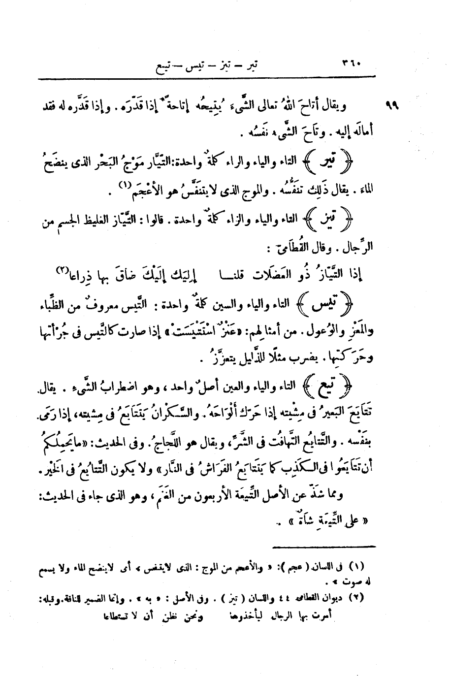 (تَيْعٌ) التَّاءُ وَالْيَاءُ وَالْعَيْنُ أَصْلٌ وَاحِدٌ، وَهُوَ اضْطِرَابُ الشَّيْءِ. يُقَالُ تَتَايَعَ الْبَعِيرُ فِي مِشْيَتِهِ إِذَا حَرَّكَ أَلْوَاحَهُ وَالسَّكْرَانُ يَتَتَايَعُ فِي مِشْيَتِهِ، إِذَا رَمَى بِنَفْسِهِ. وَالتَّتَايُعُ التَّهَافُتُ فِي الشَّرِّ، وَيُقَالُ هُوَ اللَّجَاجُ. وَفِي الْحَدِيثِ: «مَا يَحْمِلُكُمْ أَنْ تَتَايَعُوا فِي الْكَذِبِ كَمَا يَتَتَايَعُ الْفَرَاشُ فِي النَّارِ» وَلَا يَكُونُ التَّتَايُعُ فِي الْخَيْرِ.