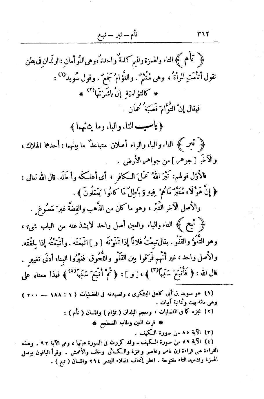 (تَبِعَ) التَّاءُ وَالْبَاءُ وَالْعَيْنُ أَصْلٌ وَاحِدٌ لَا يَشِذُّ عَنْهُ مِنَ الْبَابِ شَيْءٌ، وَهُوَ التُّلُوُّ وَالْقَفْوُ. يُقَالُ تَبِعْتُ فُلَانًا إِذَا تَلَوْتَهُ [وَ] اتَّبَعْتَهُ. وَأَتْبَعْتُهُ إِذَا لَحِقْتَهُ. وَالْأَصْلُ وَاحِدٌ، غَيْرَ أَنَّهُمْ فَرَّقُوا بَيْنَ الْقَفْوِ وَاللُّحُوقِ فَغَيَّرُوا الْبِنَاءَ أَدْنَى تَغْيِيرٍ. قَالَ اللَّهُ: {فَأَتْبَعَ سَبَبًا} [الكهف: 85] ، [وَ] : {ثُمَّ أَتْبَعَ سَبَبًا} [الكهف: 89] فَهَذَا مَعْنَاهُ عَلَى