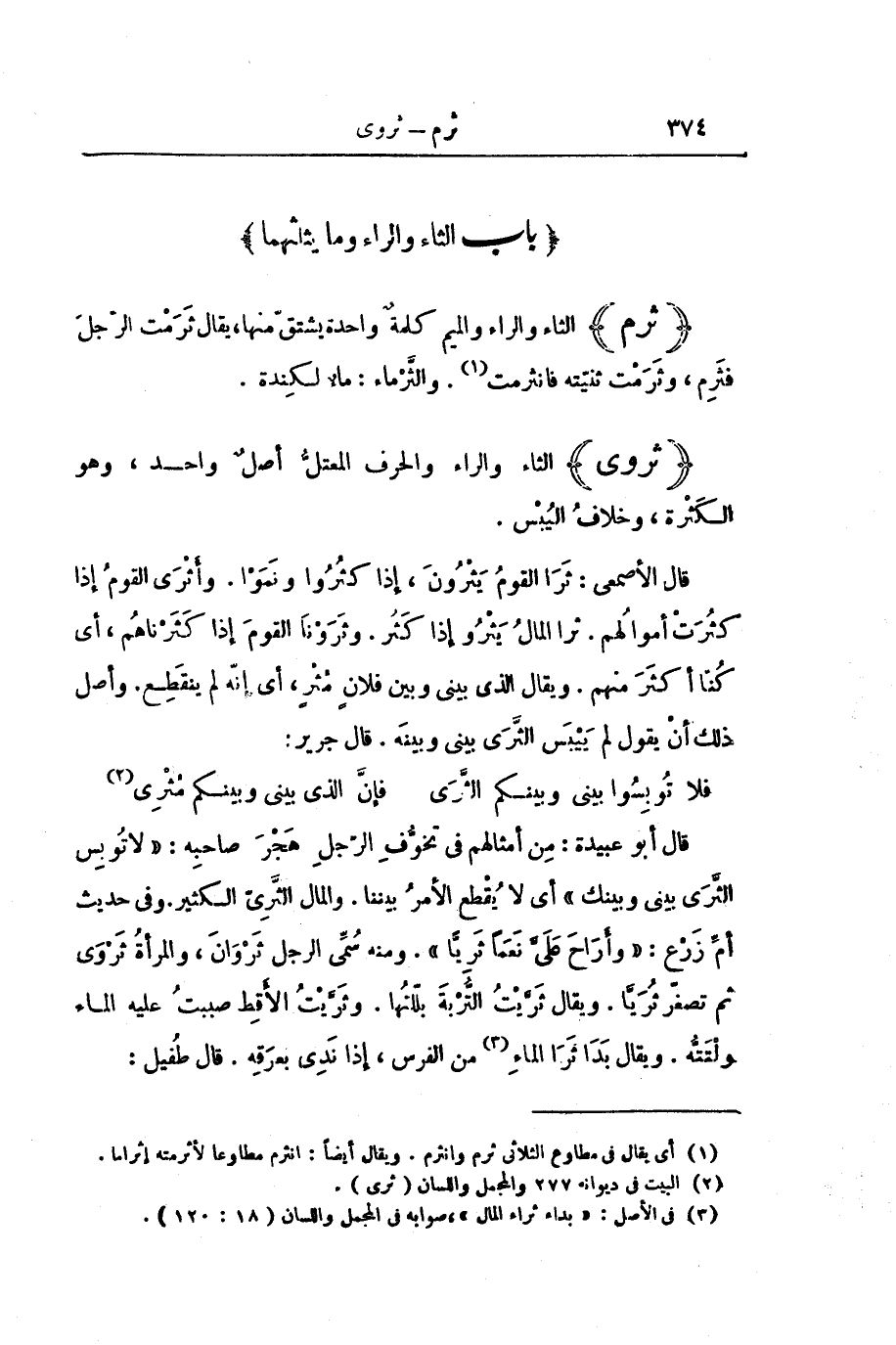 قَالَ الْأَصْمَعِيُّ: ثَرَا الْقَوْمُ يَثْرُونَ، إِذَا كَثُرُوا وَنَمَوْا. وَأَثْرَى الْقَوْمُ إِذَا كَثُرَتْ أَمْوَالُهُمْ. ثَرَا الْمَالُ يَثْرُوا إِذَا كَثُرَ. وَثَرَوْنَا الْقَوْمَ إِذَا كَثَرْنَاهُمْ، أَيْ كُنَّا أَكْثَرَ مِنْهُمْ. وَيُقَالُ الَّذِي بَيْنِي وَبَيْنَ فُلَانٍ مُثْرٍ، أَيْ إِنَّهُ لَمْ يَنْقَطِعْ. وَأَصْلُ ذَلِكَ أَنْ يَقُولَ لَمْ يَيْبَسِ الثَّرَى بَيْنِي وَبَيْنَهُ. قَالَ جَرِيرٌ: