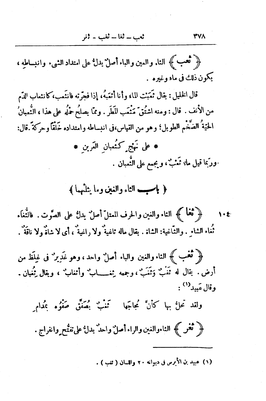 قَالَ الْخَلِيلُ: يُقَالُ ثَعَبْتُ الْمَاءَ وَأَنَا أَثْعَبُهُ، إِذَا فَجَّرْتُهُ فَانْثَعَبَ، كَانْثِعَابِ الدَّمِ مِنَ الْأَنْفِ. قَالَ: وَمِنْهُ اشْتُقَّ مَثْعَبُ الْمَطَرِ. وَمِمَّا يَصْلُحُ حَمْلُهُ عَلَى هَذَا، الثُّعْبَانُ الْحَيَّةُ الضَّخْمُ الطَّوِيلُ ; وَهُوَ مِنَ الْقِيَاسِ، فِي انْبِسَاطِهِ وَامْتِدَادِهِ خَلْقًا وَحَرَكَةً. قَالَ: