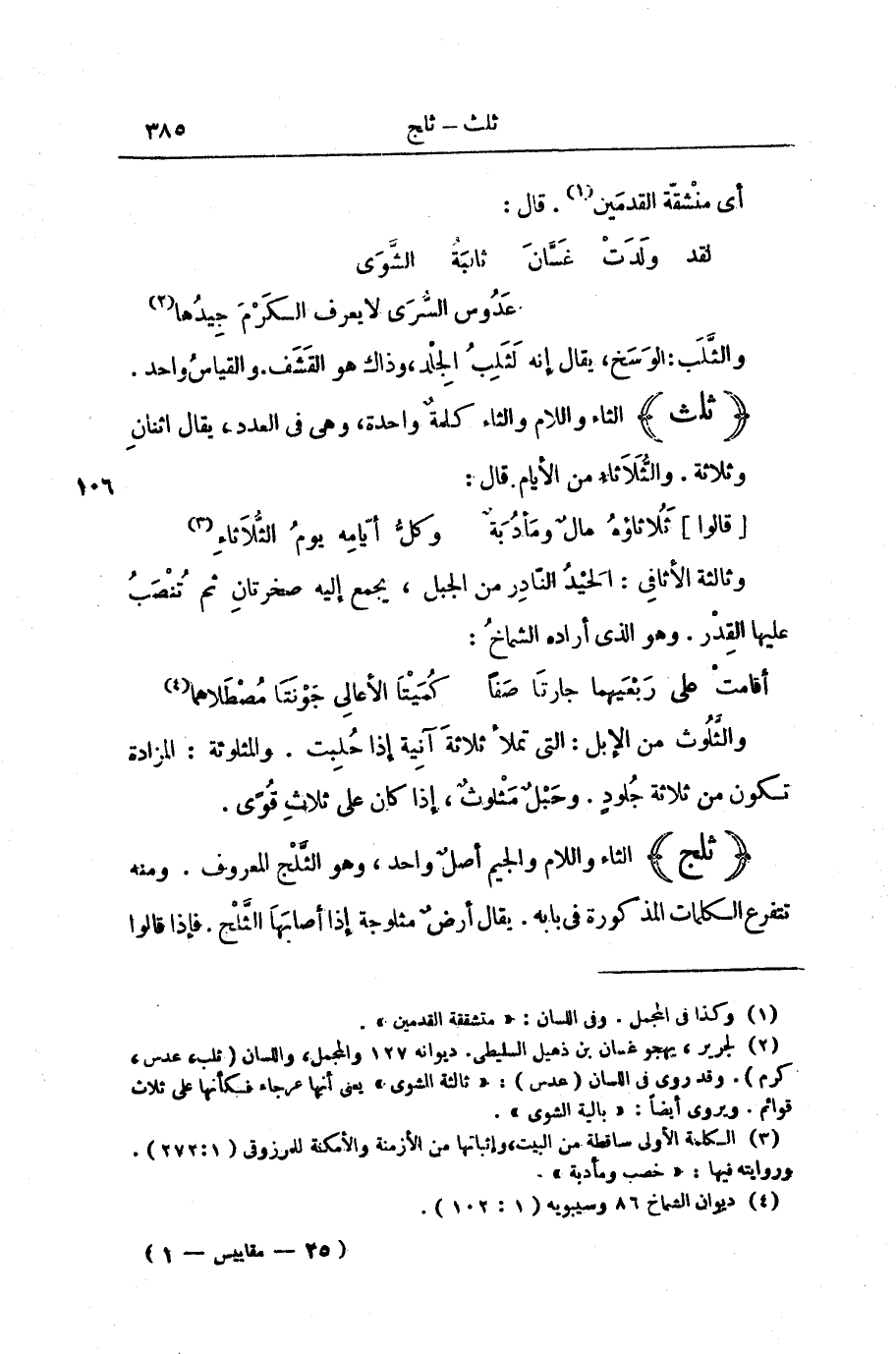 (ثَلْجٌ) الثَّاءُ وَاللَّامُ وَالْجِيمُ أَصْلٌ وَاحِدٌ، وَهُوَ الثَّلْجُ الْمَعْرُوفُ. وَمِنْهُ تَتَفَرَّعُ الْكَلِمَاتُ الْمَذْكُورَةُ فِي بَابِهِ. يُقَالُ أَرْضٌ مَثْلُوجَةٌ إِذَا أَصَابَهَا الثَّلْجُ. فَإِذَا قَالُوا