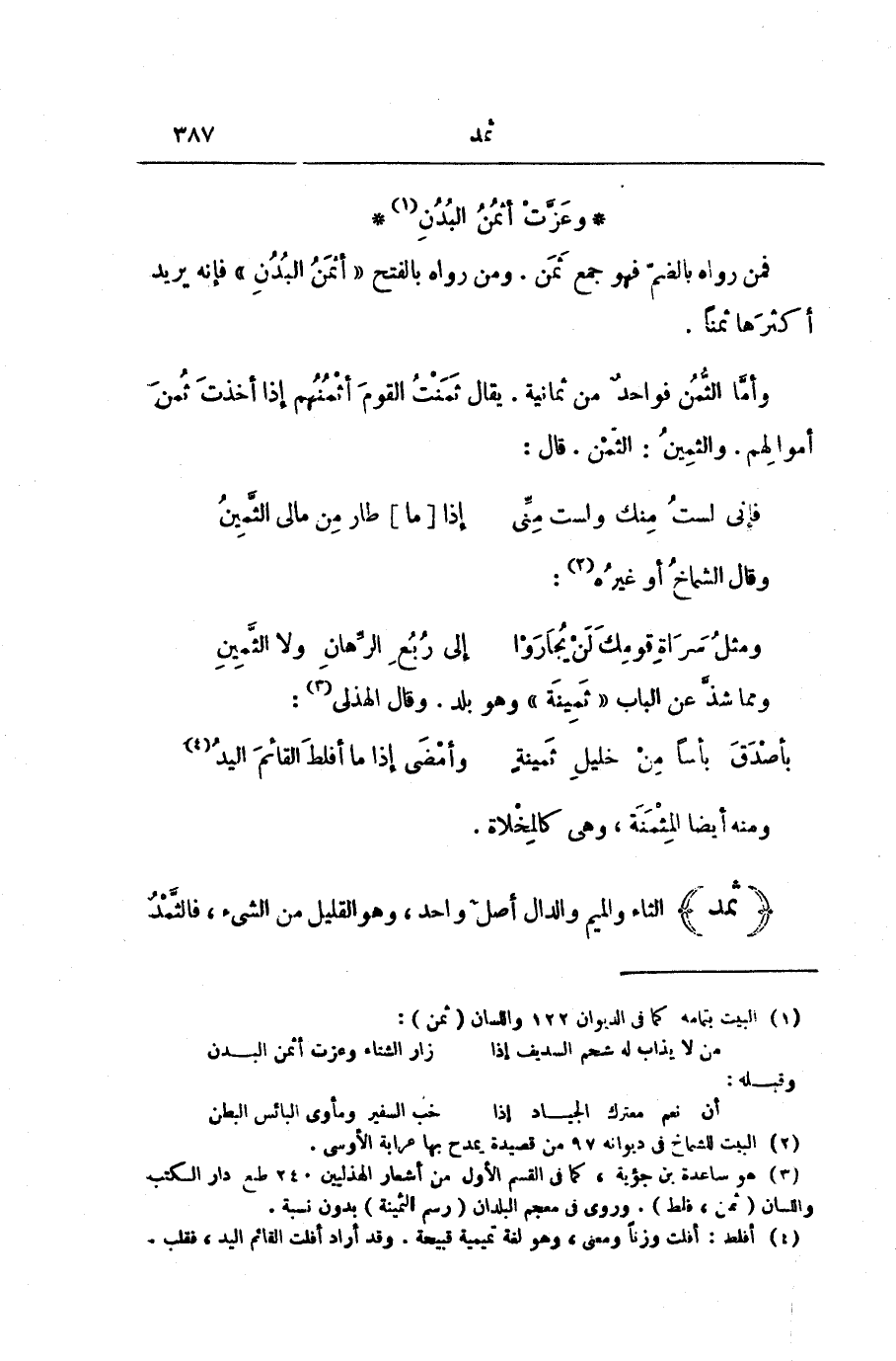 وَمِمَّا شَذَّ عَنِ الْبَابِ " ثَمِينَةُ " وَهُوَ بَلَدٌ. وَقَالَ الْهُذَلِيُّ: