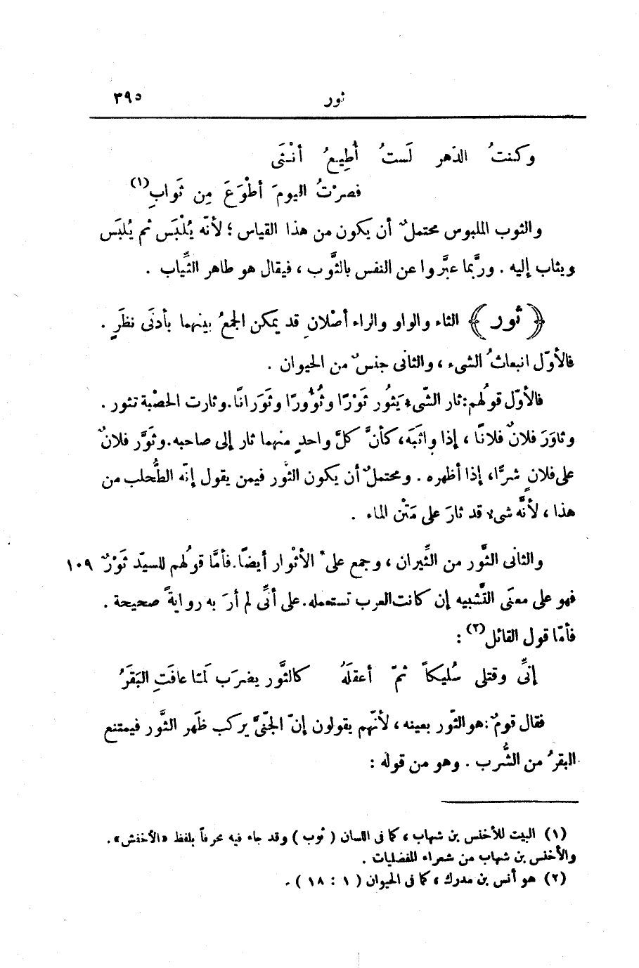 وَالثَّانِي الثَّوْرُ مِنَ الثِّيرَانِ، وَجَمْعٌ عَلَى الْأَثْوَارِ أَيْضًا. فَأَمَّا قَوْلُهُمْ لِلسَّيِّدِ ثَوْرٌ فَهُوَ عَلَى مَعْنَى التَّشْبِيهِ إِنْ كَانَتِ الْعَرَبُ تَسْتَعْمِلُهُ. عَلَى أَنِّي لَمْ أَرَ بِهِ رِوَايَةً صَحِيحَةً. فَأَمَّا قَوْلُ الْقَائِلِ: