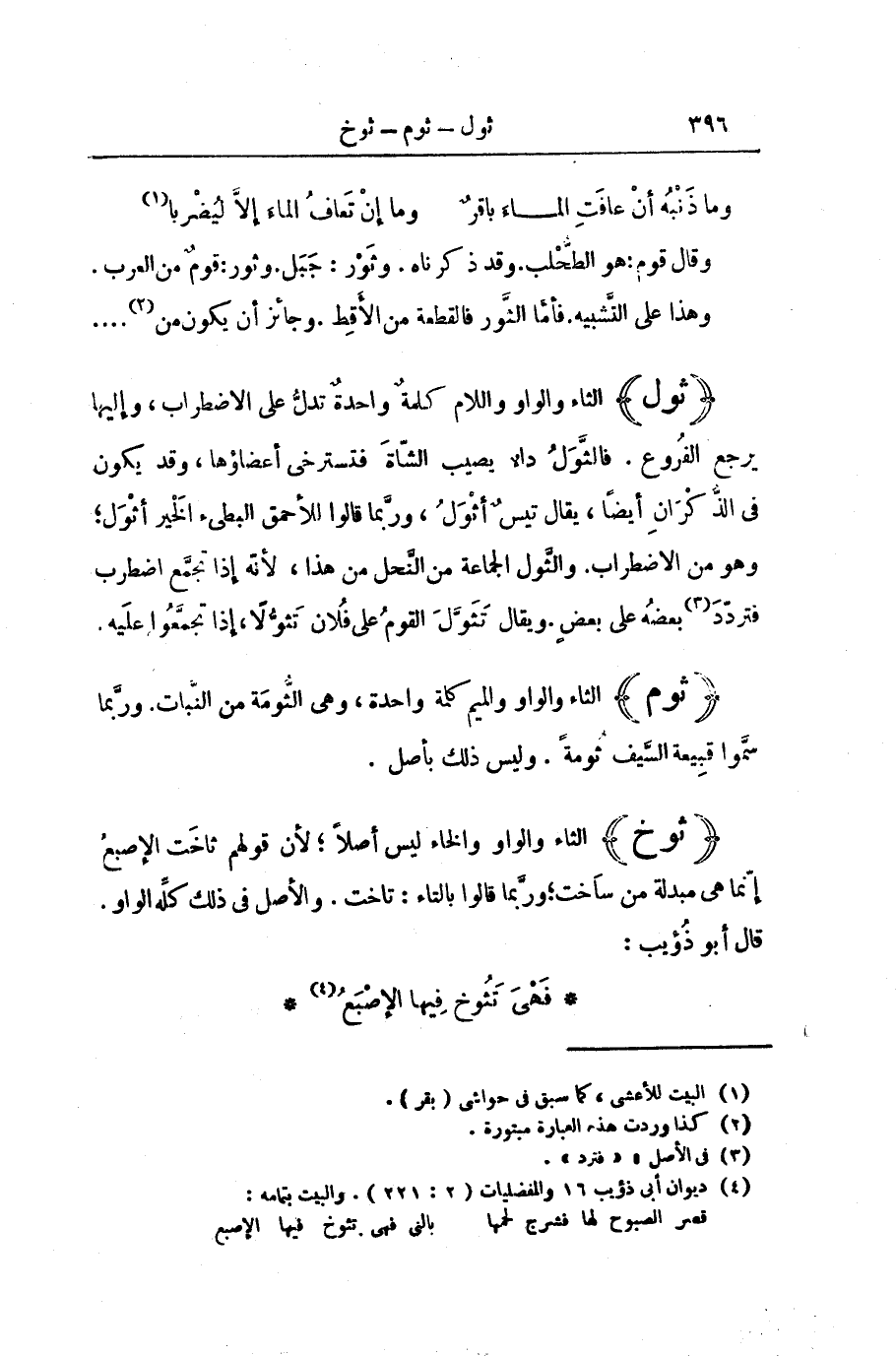 (ثَوَخَ) الثَّاءُ وَالْوَاوُ وَالْخَاءُ لَيْسَ أَصْلًا ; لِأَنَّ قَوْلَهُمْ ثَاخَتِ الْإِصْبَعُ إِنَّمَا هِيَ مُبْدَلَةٌ مِنْ سَاخَتْ ; وَرُبَّمَا قَالُوا بِالتَّاءِ: تَاخَتْ. وَالْأَصْلُ فِي ذَلِكَ كُلِّهِ الْوَاوُ. قَالَ أَبُو ذُؤَيْبٍ: