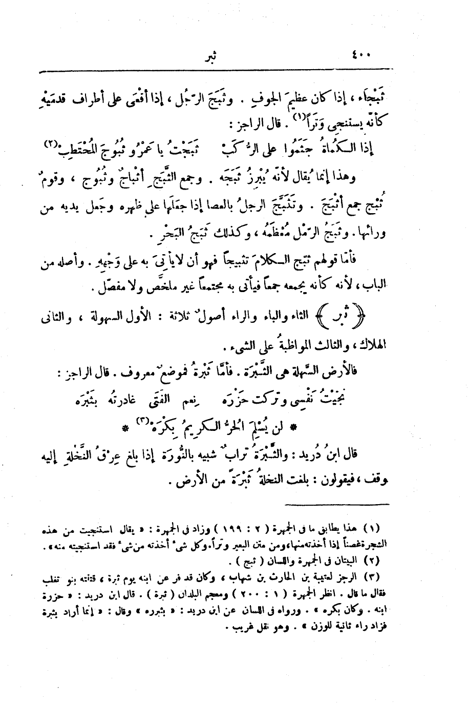 (ثَبَرَ) الثَّاءُ وَالْبَاءُ وَالرَّاءُ أُصُولٌ ثَلَاثَةٌ: الْأَوَّلُ السُّهُولَةُ، وَالثَّانِي الْهَلَاكُ، وَالثَّالِثُ الْمُوَاظَبَةُ عَلَى الشَّيْءِ.