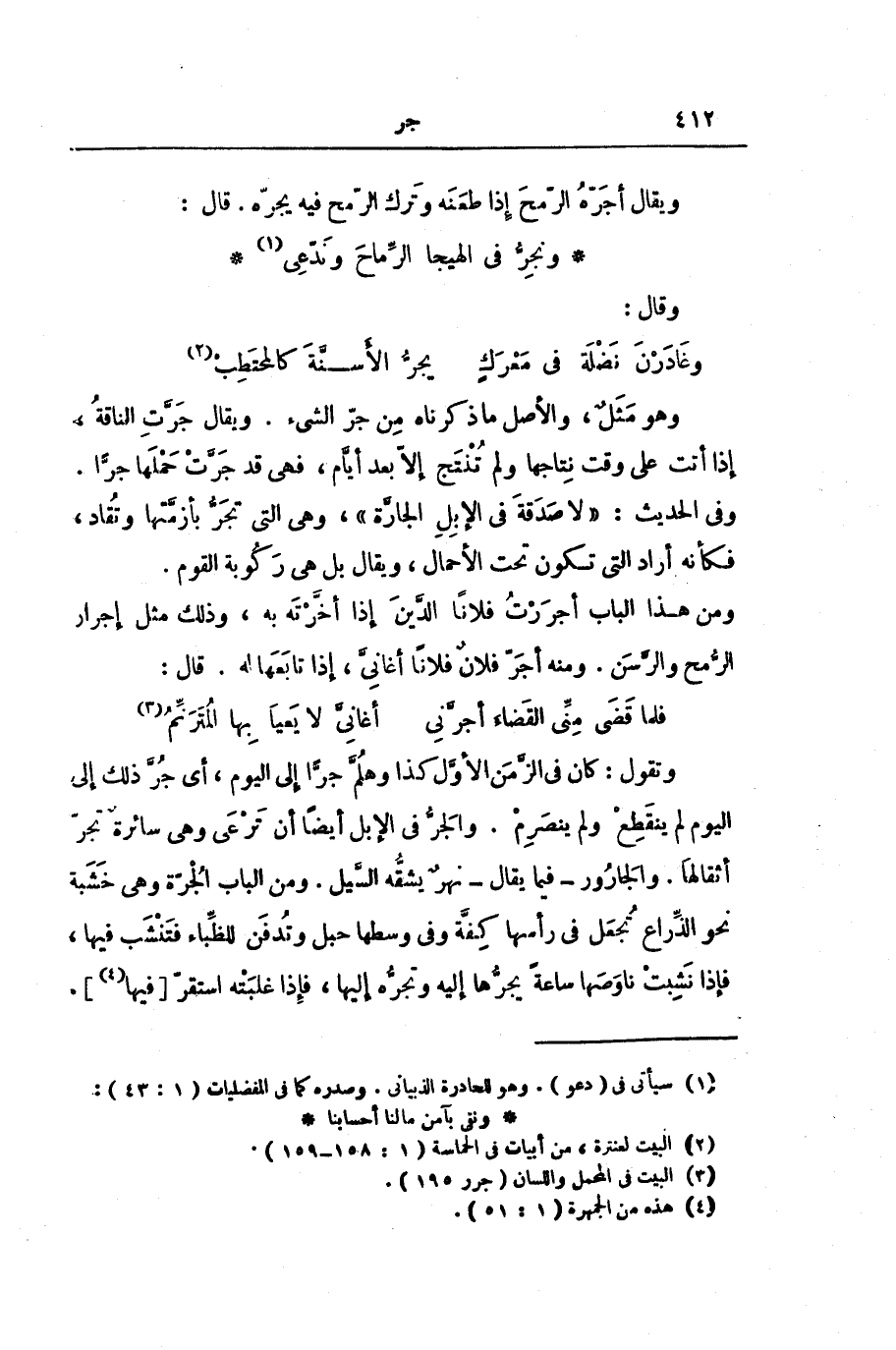 وَتَقُولُ: كَانَ فِي الزَّمَنِ الْأَوَّلِ كَذَا وَهَلُمَّ جَرًّا إِلَى الْيَوْمِ، أَيْ جُرَّ ذَلِكَ إِلَى الْيَوْمِ لَمْ يَنْقَطِعْ وَلَمْ يَنْصَرِمْ. وَالْجَرُّ فِي الْإِبِلِ أَيْضًا أَنْ تَرْعَى وَهِيَ سَائِرَةٌ تَجُرُّ أَثْقَالَهَا. وَالْجَارُورُ - فِيمَا يُقَالُ - نَهْرٌ يَشُقُّهُ السَّيْلُ. وَمِنَ الْبَابِ الْجُرَّةُ وَهِيَ خَشَبَةٌ نَحْوُ الذِّرَاعِ تُجْعَلُ فِي رَأْسِهَا كِفَّةٌ وَفِي وَسَطِهَا حَبْلٌ وَتُدْفَنُ لِلظِّبَاءِ فَتَنْشَبُ فِيهَا، فَإِذَا نَشِبَتْ نَاوَصَهَا سَاعَةً يَجُرُّهَا إِلَيْهِ وَتَجُرُّهُ إِلَيْهَا، فَإِذَا غَلَبَتْهُ اسْتَقَرَّ [فِيهَا] .