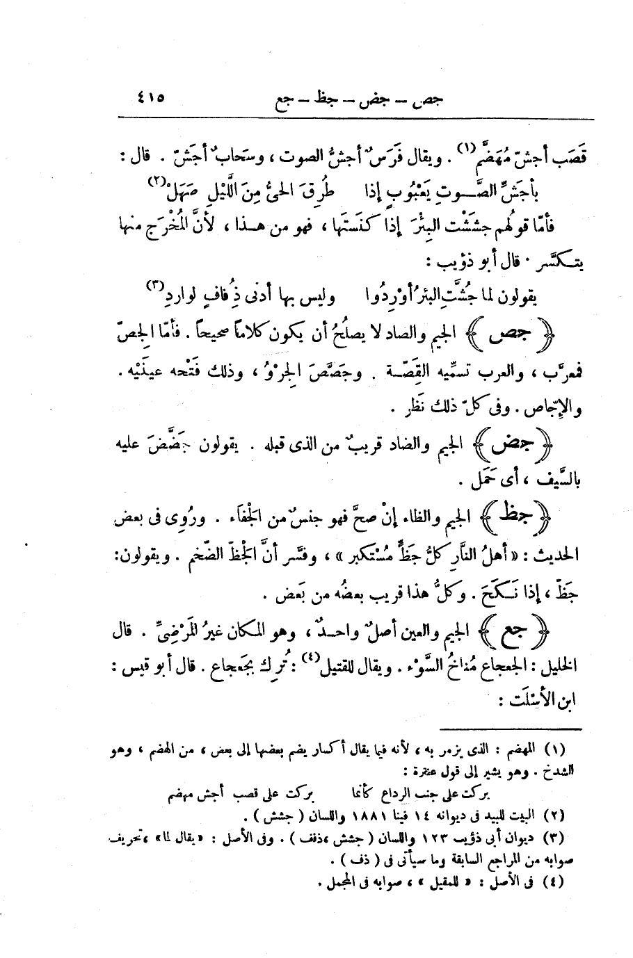 فَأَمَّا قَوْلُهُمْ جَشَشْتُ الْبِئْرَ إِذَا كَنَسْتَهَا، فَهُوَ مِنْ هَذَا، لِأَنَّ الْمَخْرَجَ مِنْهَا يَتَكَسَّرُ. قَالَ أَبُو ذُؤَيْبٍ: