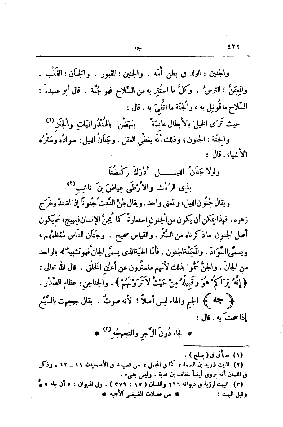 وَيُقَالُ جُنُونُ اللَّيْلِ، وَالْمَعْنَى وَاحِدٌ. وَيُقَالُ جُنَّ النَّبْتُ جُنُونًا إِذَا اشْتَدَّ وَخَرَجَ زَهْرُهُ. فَهَذَا يُمْكِنُ أَنْ يَكُونَ مِنَ الْجُنُونِ اسْتِعَارَةً كَمَا يُجَنُّ الْإِنْسَانُ فَيَهِيجُ، ثُمَّ يَكُونُ أَصْلُ الْجُنُونِ مَا ذَكَرْنَاهُ مِنَ السَّتْرِ. وَالْقِيَاسُ صَحِيحٌ. وَجَنَانُ النَّاسِ مُعْظَمُهُمْ، وَيُسَمَّى السَّوَادَ. وَالْمَجَنَّةُ الْجُنُونُ. فَأَمَّا الْحَيَّةُ الَّذِي يُسَمَّى الْجَانَّ فَهُوَ تَشْبِيهٌ لَهُ بِالْوَاحِدِ مِنَ الْجَانِّ. وَالْجِنُّ سُمُّوا بِذَلِكَ لِأَنَّهُمْ مُتَسَتِّرُونَ عَنْ أَعْيُنِ الْخَلْقِ. قَالَ اللَّهُ تَعَالَى: {إِنَّهُ يَرَاكُمْ هُوَ وَقَبِيلُهُ مِنْ حَيْثُ لَا تَرَوْنَهُمْ} [الأعراف: 27] . وَالْجَنَاجِنُ: عِظَامُ الصَّدْرِ.
