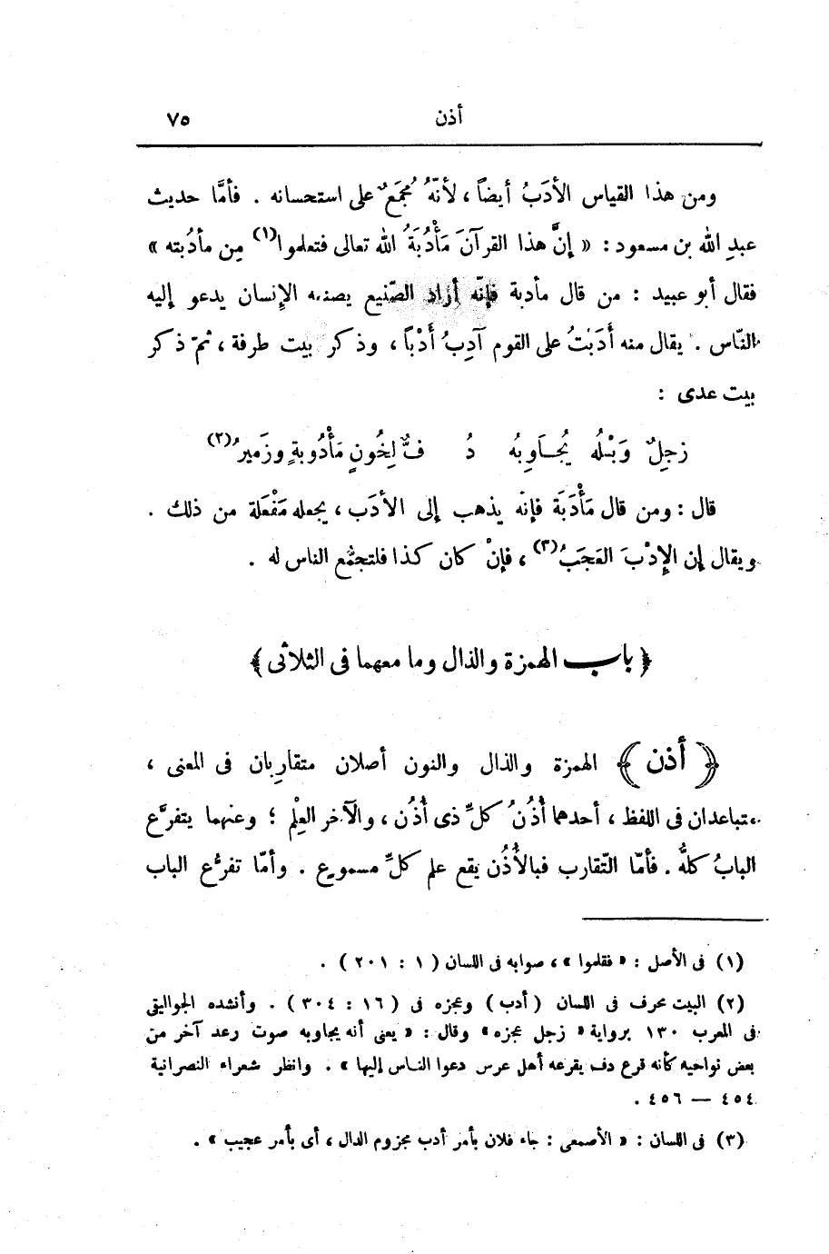 وَمِنْ هَذَا الْقِيَاسِ الْأَدَبُ أَيْضًا، لِأَنَّهُ مُجْمَعٌ عَلَى اسْتِحْسَانِهِ. فَأَمَّا حَدِيثُ عَبْدِ اللَّهِ بْنِ مَسْعُودٍ: «إِنَّ هَذَا الْقُرْآنَ مَأْدُبَةُ اللَّهِ تَعَالَى فَتَعَلَّمُوا مِنْ مَأْدُبَتِهِ» فَقَالَ أَبُو عُبَيْدٍ: مَنْ قَالَ " مَأْدُبَةٌ " فَإِنَّهُ أَرَادَ الصَّنِيعَ يَصْنَعُهُ الْإِنْسَانُ يَدْعُو إِلَيْهِ النَّاسَ. يُقَالُ مِنْهُ أَدَبْتُ عَلَى الْقَوْمِ آدِبُ أَدْبًا، وَذَكَرَ بَيْتَ طَرَفَةَ، ثُمَّ ذَكَرَ بَيْتَ عَدِيٍّ: