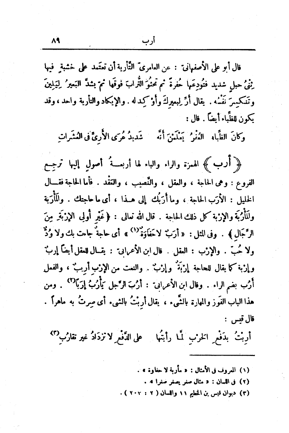 (أَرَبَ) الْهَمْزَةُ وَالرَّاءُ وَالْبَاءُ لَهَا أَرْبَعَةُ أُصُولٍ إِلَيْهَا تَرْجِعُ الْفُرُوعُ: وَهِيَ الْحَاجَةُ، وَالْعَقْلُ، وَالنَّصِيبُ، وَالْعَقْدُ. فَأَمَّا الْحَاجَةُ فَقَالَ الْخَلِيلُ: الْأَرَبُ الْحَاجَةُ، وَمَا أَرَبُكَ إِلَى هَذَا، أَيْ: مَا حَاجَتُكَ. وَالْمَأْرَبَةُ وَالْمَأْرُبَةُ وَالْإِرْبَةُ، كُلُّ ذَلِكَ الْحَاجَةُ. قَالَ اللَّهُ تَعَالَى: {غَيْرِ أُولِي الْإِرْبَةِ مِنَ الرِّجَالِ} [النور: 31] . وَفِي الْمَثَلِ: " أَرَبٌ لَا حَفَاوَةٌ "، أَيْ: حَاجَةٌ جَاءَتْ بِكَ وَلَا وُدٌّ وَلَا حُبٌّ. وَالْإِرْبُ: الْعَقْلُ. قَالَ ابْنُ الْأَعْرَابِيِّ: يُقَالُ لِلْعَقْلِ أَيْضًا إِرْبٌ وَإِرْبَةٌ كَمَا يُقَالُ لِلْحَاجَةِ إِرْبَةٌ وَإِرْبٌ. وَالنَّعْتُ مِنَ الْإِرْبِ أَرِيبٌ، وَالْفِعْلُ أَرُبَ بِضَمِّ الرَّاءِ. وَقَالَ ابْنُ الْأَعْرَابِيِّ: أَرُبَ الرَّجُلُ يَأْرُبُ إِرَبًا. وَمِنْ هَذَا الْبَابِ الْفَوْزُ وَالْمَهَارَةُ بِالشَّيْءِ، يُقَالُ: أَرِبْتُ بِالشَّيْءِ، أَيْ: صِرْتُ بِهِ مَاهِرًا. قَالَ قَيْسٌ: