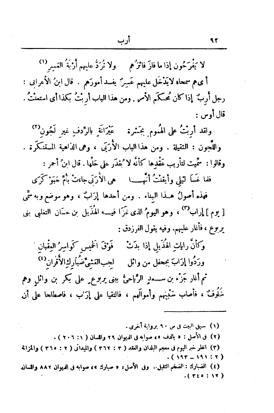 فَهَذِهِ أُصُولُ هَذَا الْبِنَاءِ. وَمِنْ أَحَدِهَا إِرَابٌ، وَهُوَ مَوْضِعٌ وَبِهِ سُمِّيَ [يَوْمُ] إِرَابٍ، وَهُوَ الْيَوْمُ الَّذِي غَزَا فِيهِ الْهُذَيلُ بْنُ حَسَّانَ التَّغْلِبِيُّ بَنِي يَرْبُوعٍ، فَأَغَارَ عَلَيْهِمْ. وَفِيهِ يَقُولُ الْفَرَزْدَقُ: