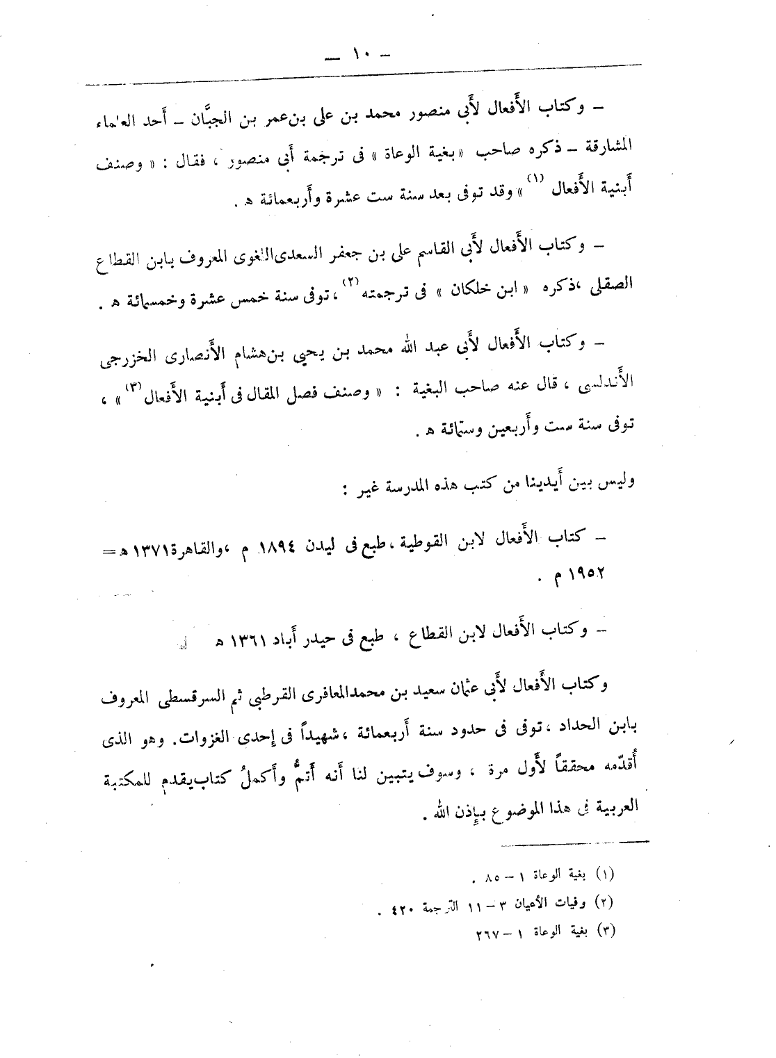- وكتاب الأفعال لابن القطاع، طبع فى حيدرأباد 1361 هـ