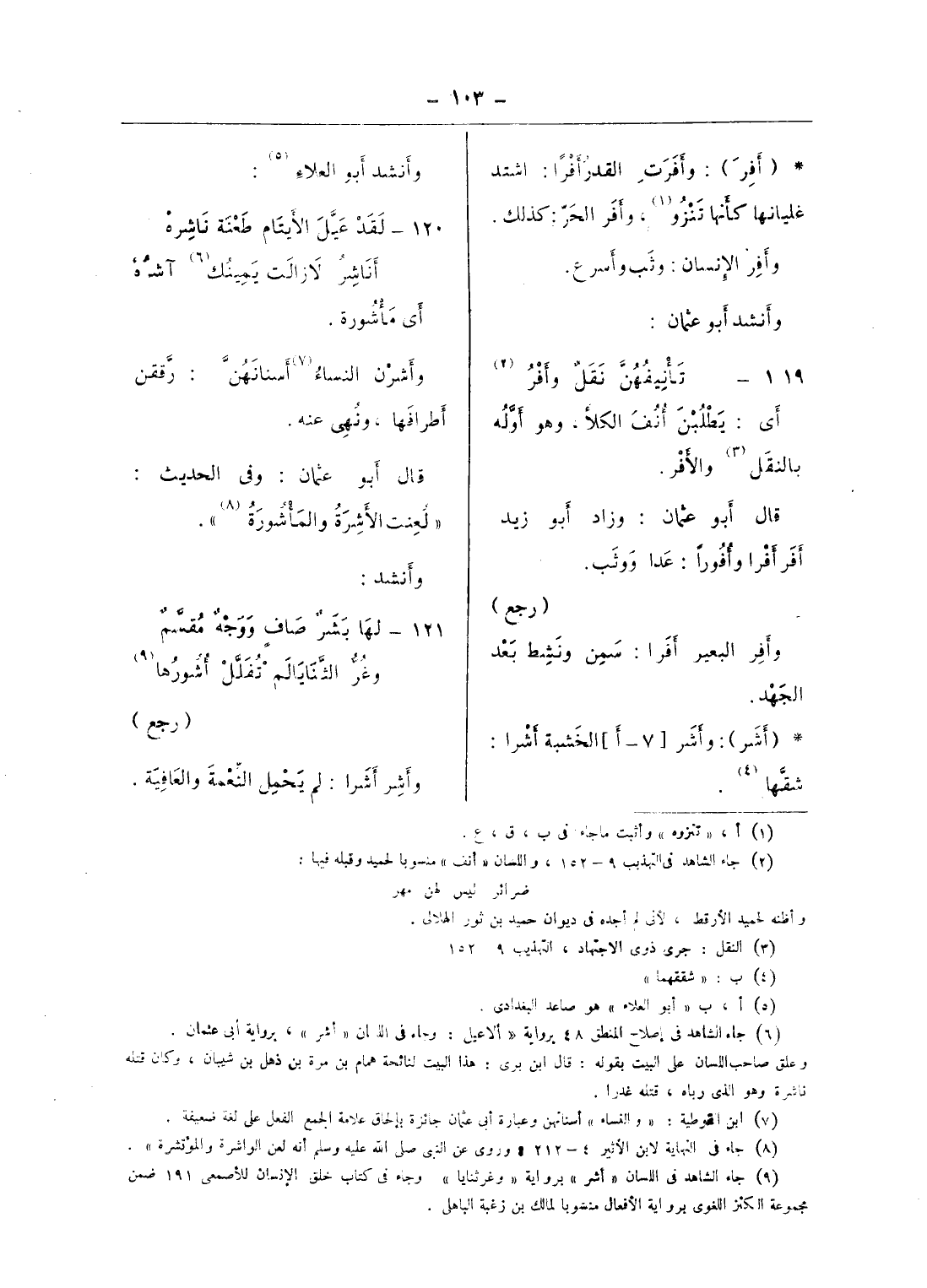 (¬9) جاء الشاهد فى اللسان «أشر» برواية «وغر ثنايا» وجاء فى كتاب خلق الإنسان للأصمعى 191 ضمن مجموعة الكنز اللغوى برواية الأفعال منسوبا لمالك بن زغبة الباهلى.