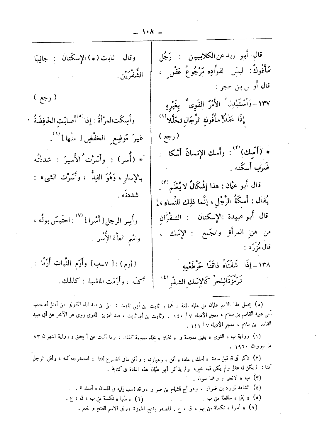 (¬2) ذكر فى ق قبل مادة «أسك» مادة «أفن» وعبارته: وأفن ما فى الضرع أفنا: استخرجه كله، وأفن الرجل أفنا: لم يكن له عقل ولم يكن فيه خير، ولم يذكر أبو عثمان هذه المادة فى كتابه.