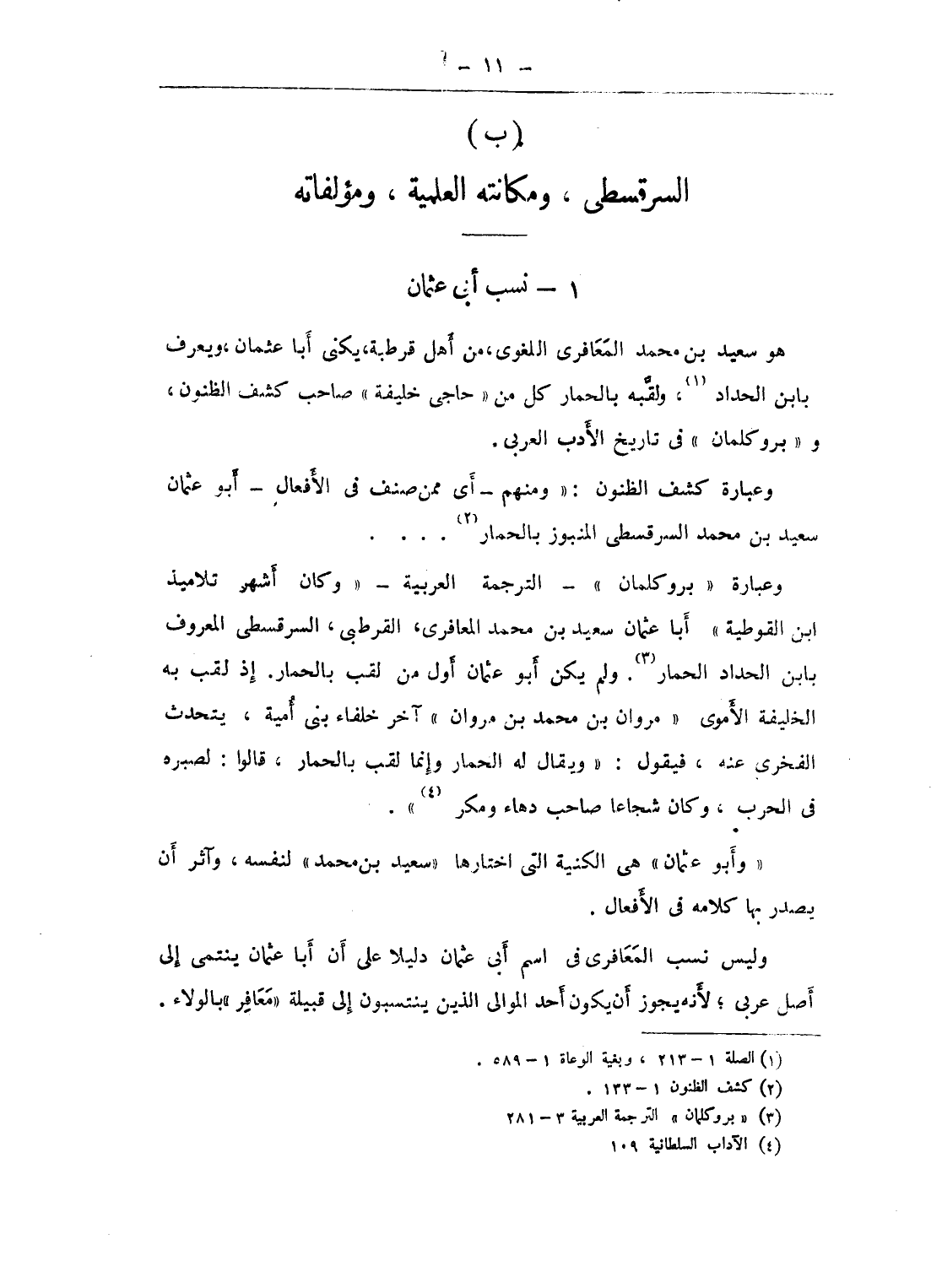 وعبارة كشف الظنون: «ومنهم - أى ممن صنف فى الأفعال - أبو عثمان سعيد بن محمد السرقسطى المنبوز بالحمار (¬2) ...