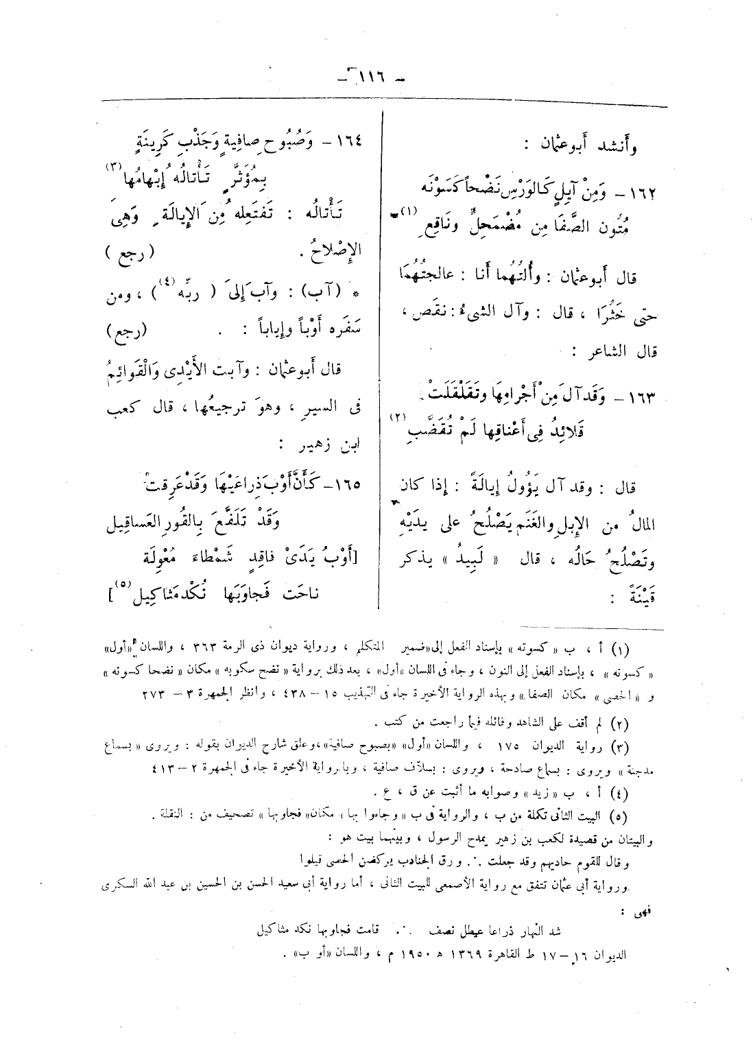 ورواية أبى عثمان تتفق مع رواية الأصمعى للبيت الثانى، أما رواية أبى سعيد الحسن بن الحسين بن عبد الله السكرى فهى: