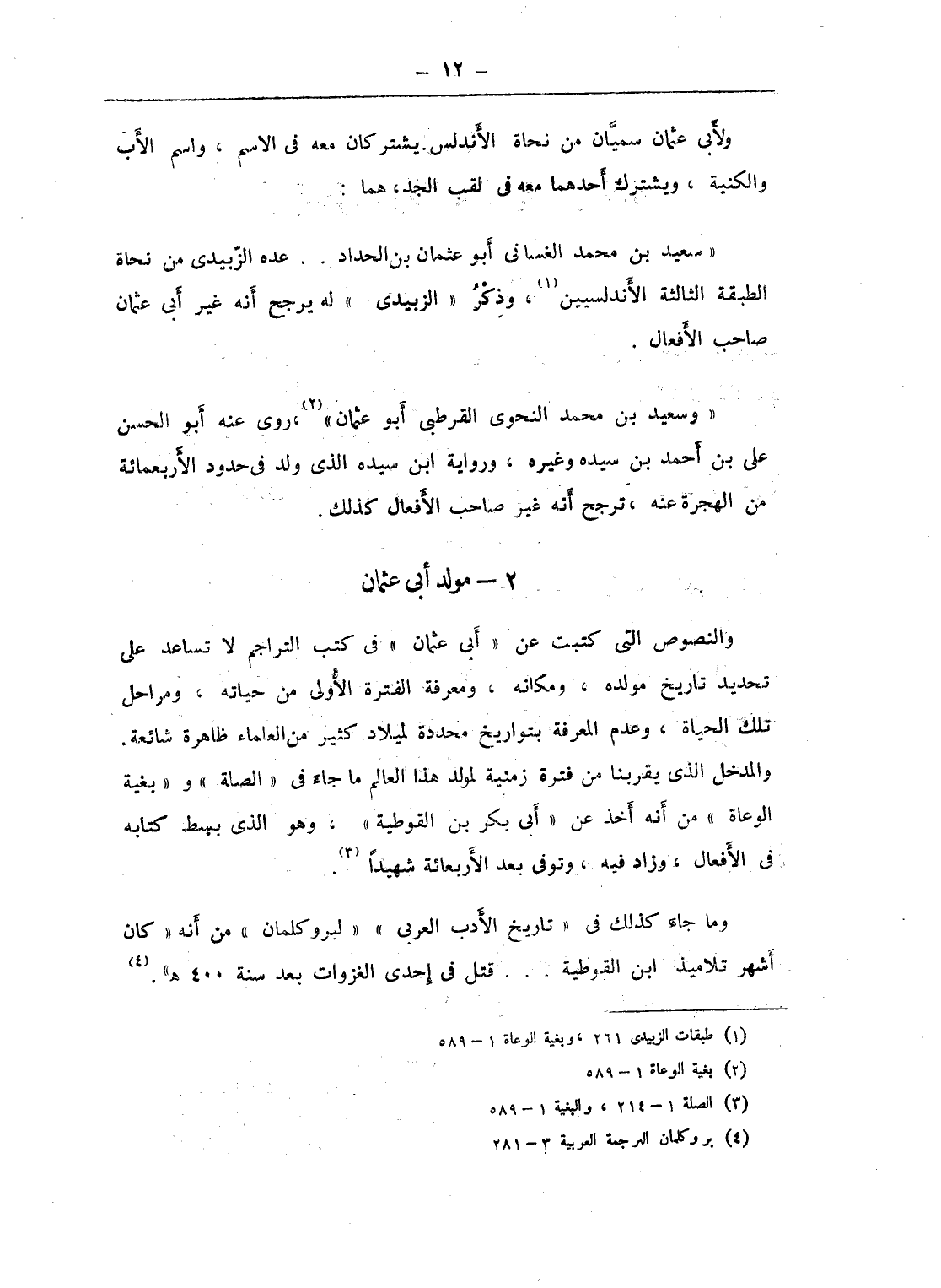 «سعيد بن محمد الغسانى أبو عثمان بن الحداد .. عده الزّبيدى من نحاة الطبقة الثالثة الأندلسيين (¬1)، وذكر «الزبيدى» له يرجح أنه غير أبى عثمان صاحب الأفعال.
