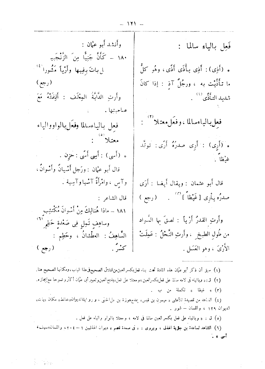 (¬2) ق: «وبالياء فى لامه سالما على فعل بكسر العين، ومعتلا على فعل» بفتح العين وتعبير أبى عثمان أكثر وضوحا مع إيجازه.