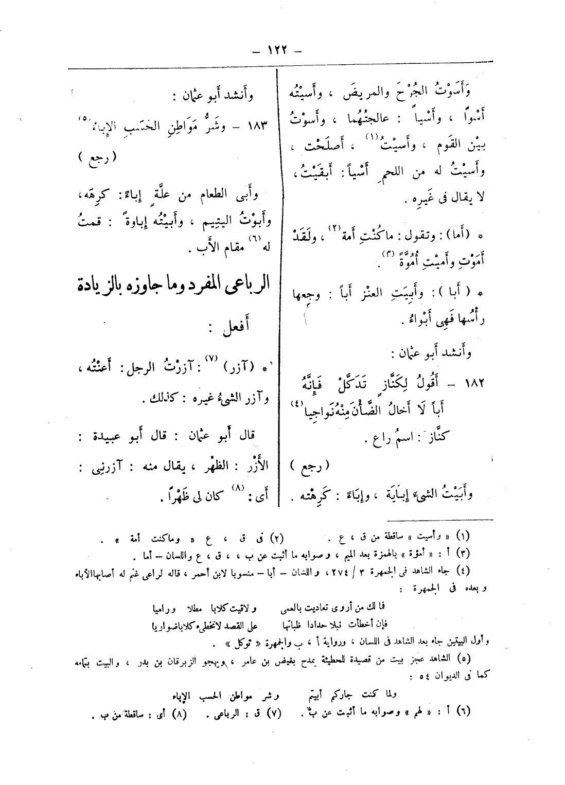 (¬4) جاء الشاهد فى الجمهرة 3/ 274، واللسان - أبا - منسوبا لابن أحمر، قاله لراعى غنم له أصابها الأباء وبعده فى الجمهرة: