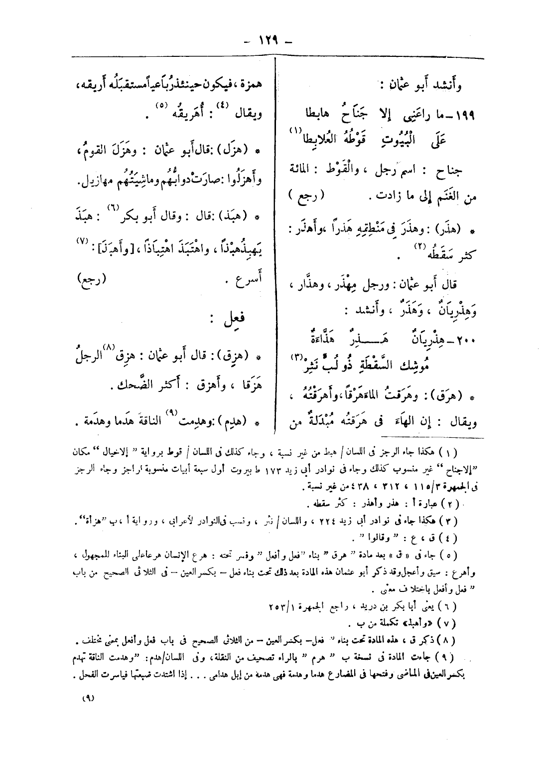 (¬5) جاء فى «ق» بعد مادة هرق بناء فعل وأفعل وفسر تحته: هرع الإنسان هرعا على البناء للمجهول، وأهرع: سيق وأعجل وقد ذكر أبو عثمان هذه المادة بعد ذلك تحت بناء فعل - بكسر العين - فى الثلاثى الصحيح من باب فعل وأفعل باختلاف معنى.