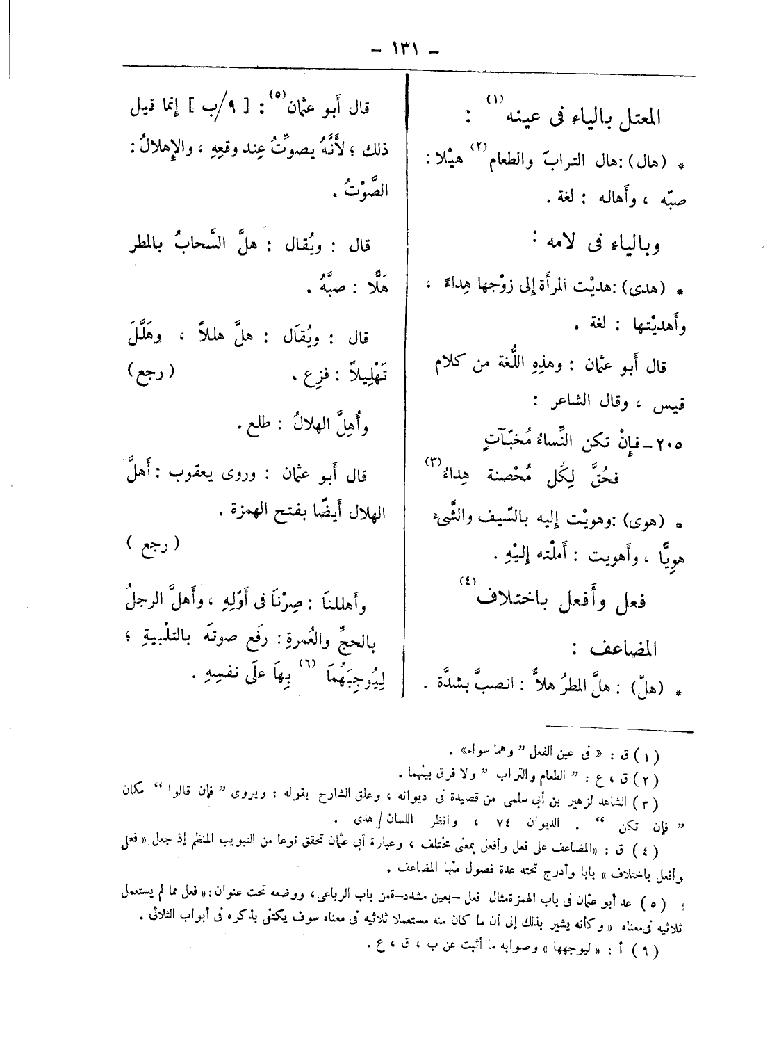 (¬4) ق: «المضاعف على فعل وأفعل بمعنى مختلف، وعبارة أبى عثمان تحقق نوعا من التبويب المنظم إذ جعل «فعل وأفعل باختلاف» بابا وأدرج تحته عدة فصول منها المضاعف.