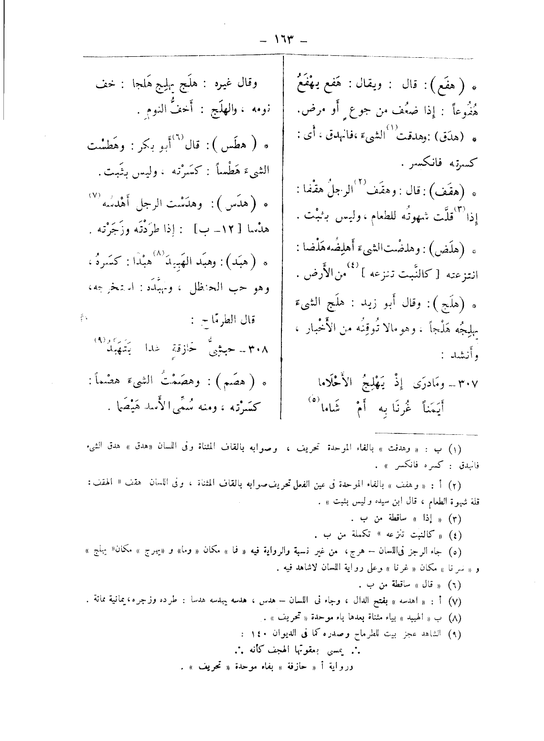 (¬1) ب: «وهدفت» بالفاء الموحدة تحريف، وصوابه بالقاف المثناة وفى اللسان «هدق» هدق الشئ فانهدق: كسره فانكسر».