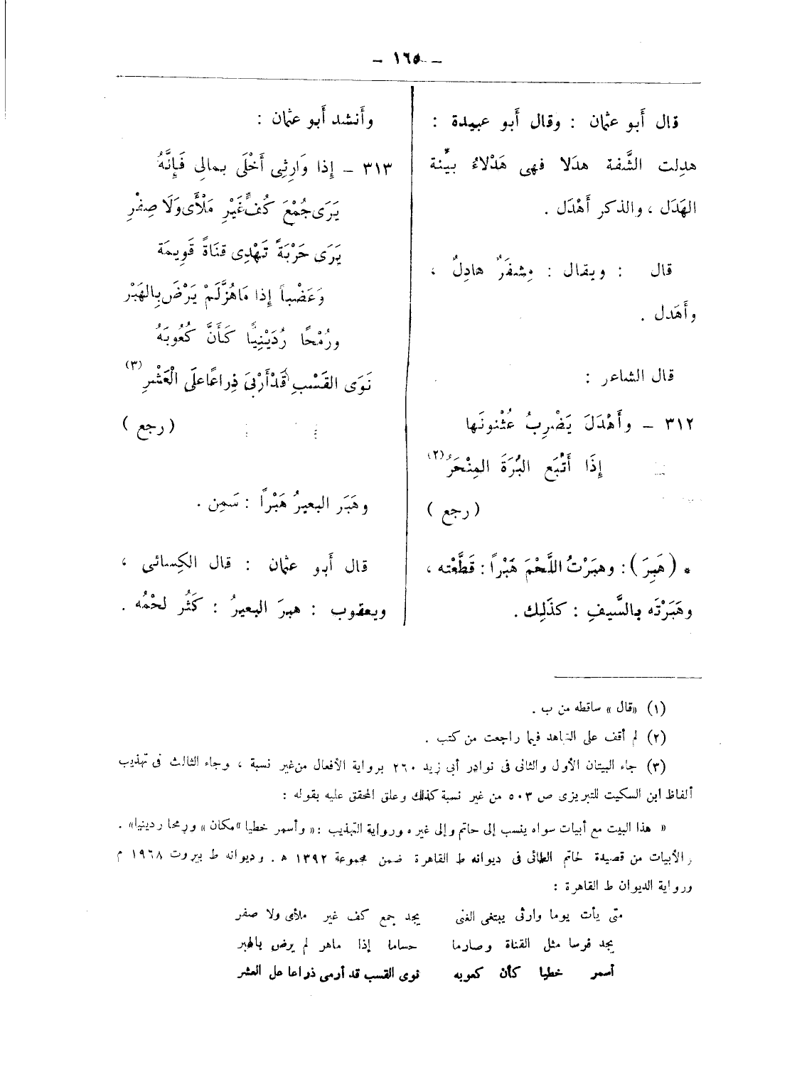 «هذا البيت مع أبيات سواه ينسب إلى حاتم وإلى غيره ورواية التهذيب: «وأسمر خطيا» مكان» ورمحار دينيا».