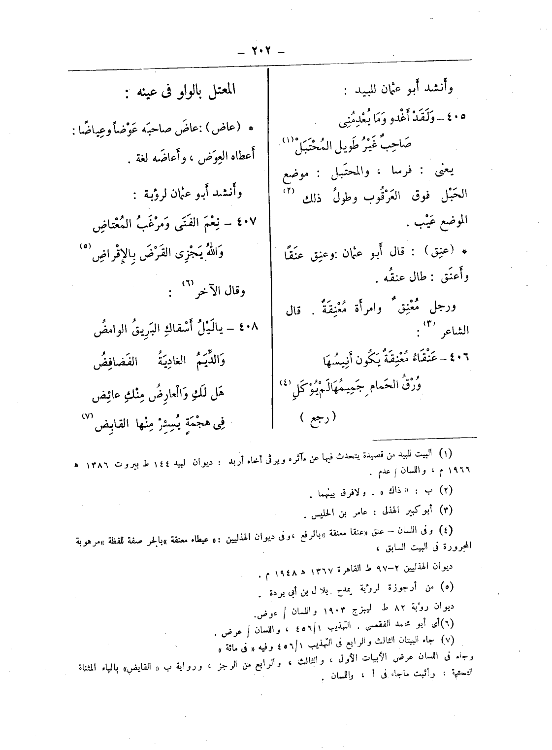 (¬1) البيت للبيد من قصيدة يتحدث فيها عن مآثره ويرثى أخاه أربد: ديوان لبيد 144 ط بيروت 1386 هـ 1966 م، واللسان/ عدم.