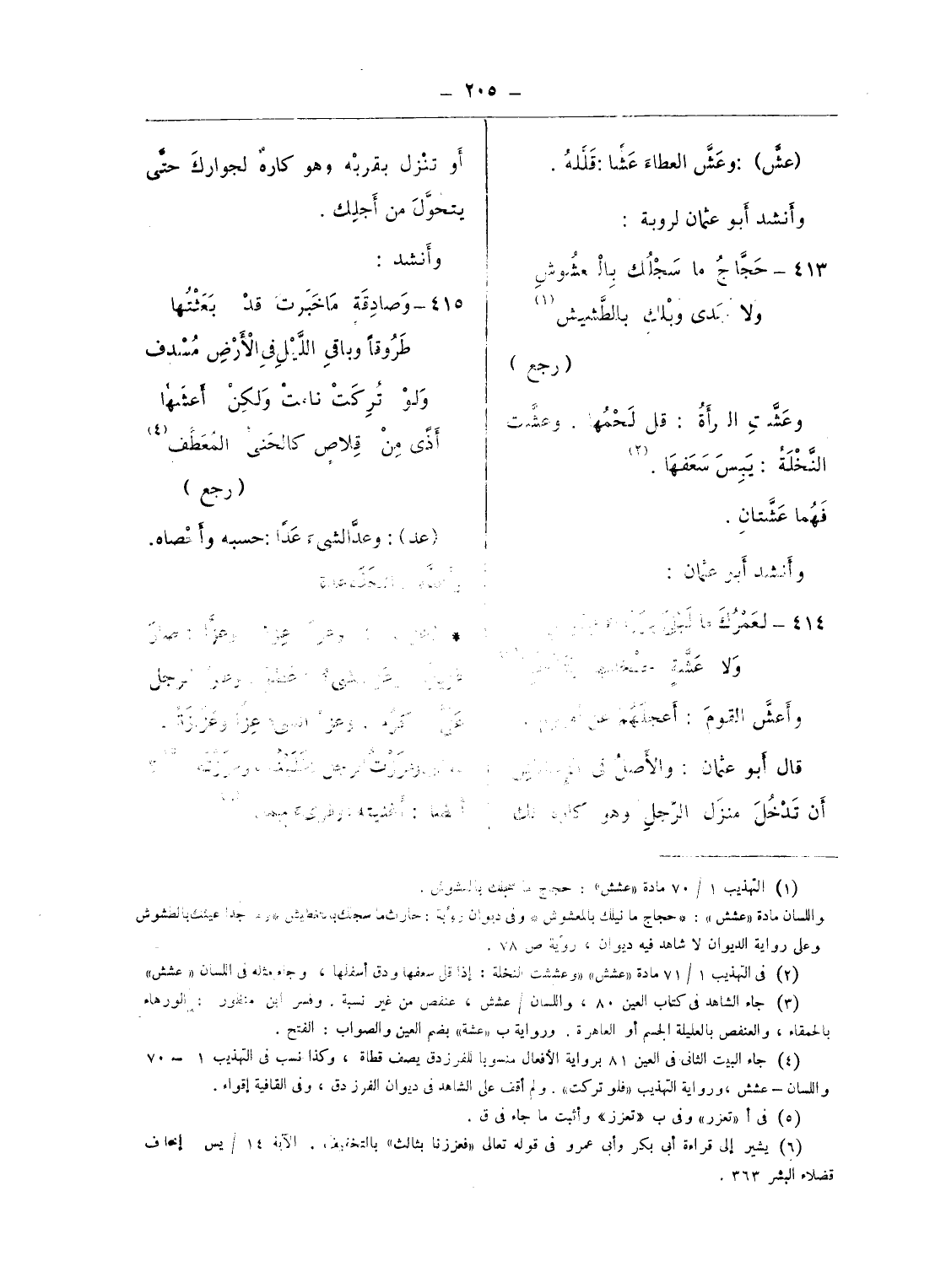 (¬4) جاء البيت الثانى فى العين 81 برواية الأفعال منسوبا للفرزدق يصف قطاة، وكذا نسب فى التهذيب 1 - 70 واللسان - عشش، ورواية التهذيب «فلو تركت». ولم أقف على الشاهد فى ديوان الفرزدق، وفى القافية إقواء.