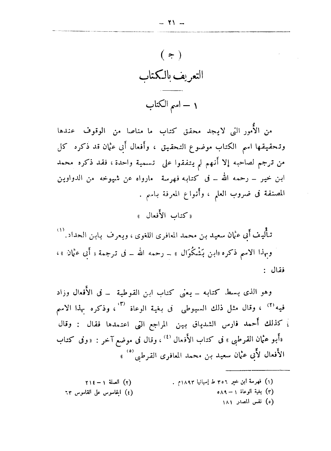 وهو الذى بسط كتابه - يعنى كتاب ابن القوطية - فى الأفعال وزاد فيه (¬2)، وقال مثل ذلك السيوطى فى بغية الوعاة (¬3)، وذكره بهذا الاسم كذلك أحمد فارس الشدياق بين المراجع التى اعتمدها فقال: وقال «أبو عثمان القرطبى» فى كتاب الأفعال (¬4)، وقال فى موضع آخر: «وفى كتاب الأفعال لأبى عثمان سعيد بن محمد المعافرى القرطبى (¬5)»