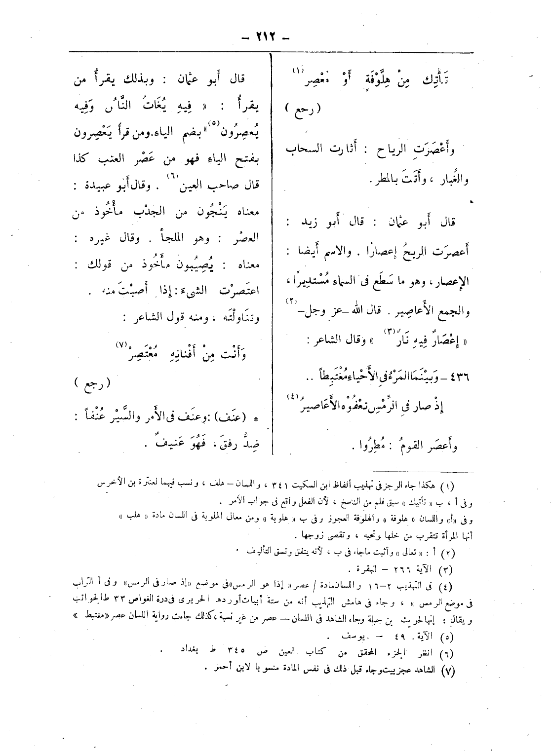 قال أبو عثمان: وبذلك يقرأ من يقرأ: «فيه يغات الناس وفيه يعصرون (¬5)» بضم الياء. ومن قرأ يعصرون بفتح الياء فهو من عصر العنب كذا قال صاحب العين (¬6). وقال أبو عبيدة: