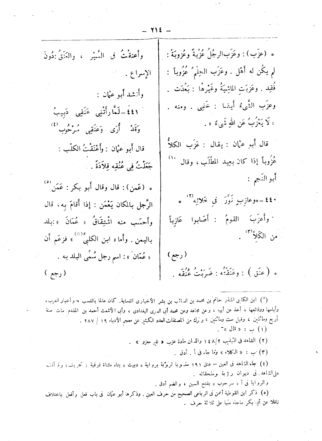 قال وقال أبو بكر: عمن (¬5) الرّجل بالمكان يعمن: إذا أقام به، قال وأحسب منه اشتقاق «عمان»: بلد باليمن. وأما «ابن الكلبىّ «*»» فزعم أن «عمان»: اسم رجل سمّى البلد به.