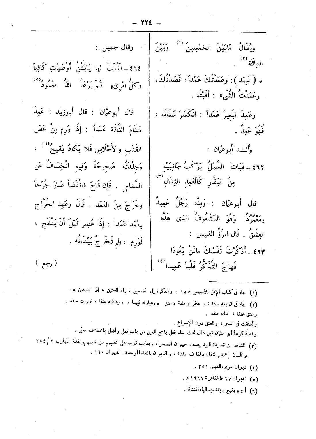 قال أبو عثمان: قال أبو زيد: عمد سنام النّاقة عمدا: إذا ورم من عضّ القتب والأحلاس فلا يكاد يقيح (¬6)، وجلدته صحيحة وفيه انخساف عن السّنام. فإن قاح فانفقأ صار جرحا وخرج من العمد. قال وعمد الخرّاج يعمد عمدا: إذا عصر قبل أن ينضج، فورم، ولم تخرج بيضته.
