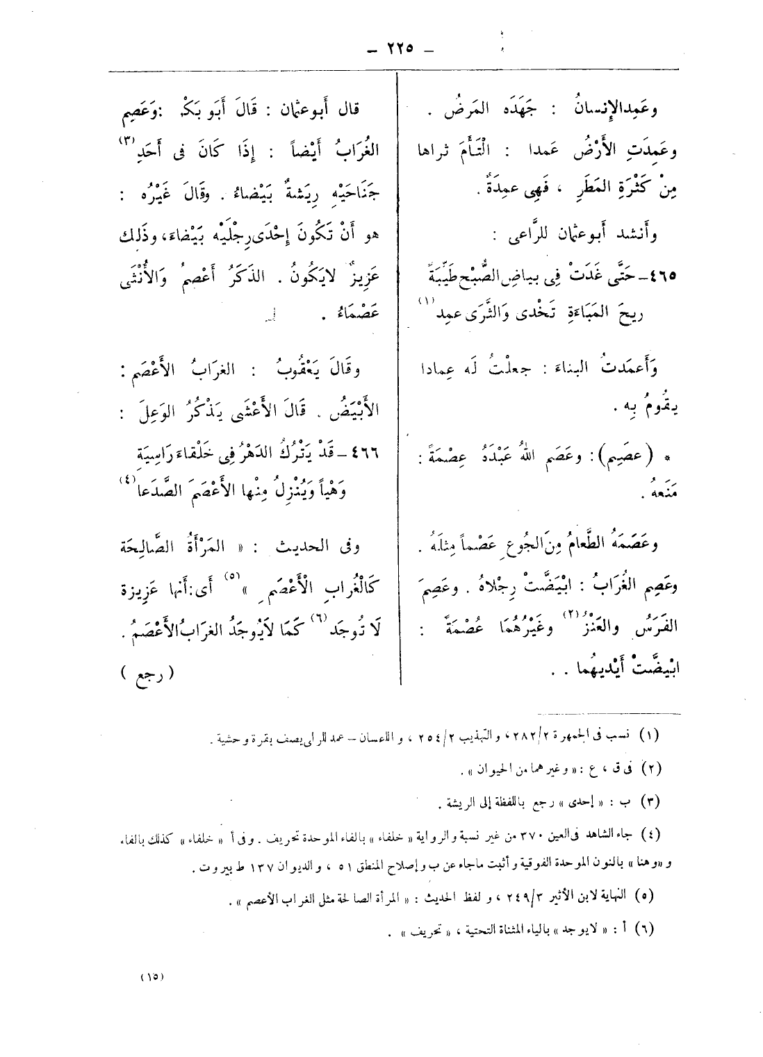 قال أبو عثمان: قال أبو بكر: وعصم الغراب أيضا: إذا كان فى أحد (¬3) جناحيه ريشة بيضاء. وقال غيره: