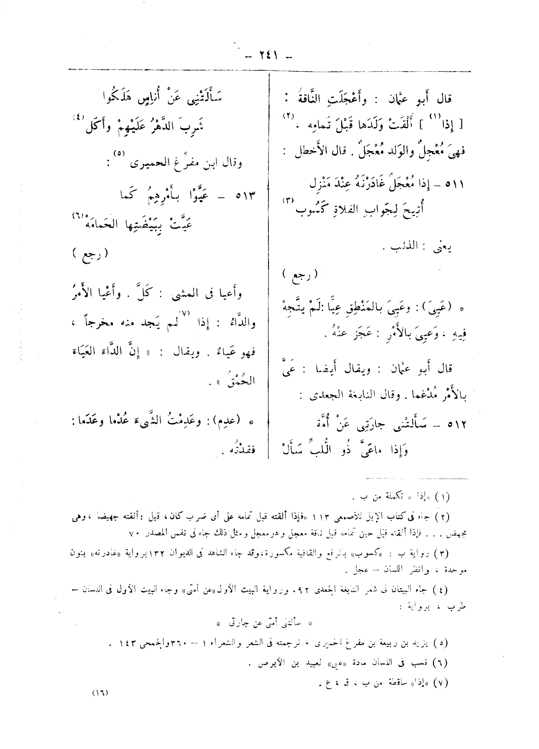 (¬3) رواية ب: «كسوب» بالرفع والقافية مكسورة، وقد جاء الشاهد فى الديوان 132 برواية «غادرنه» بنون موحدة، وانظر اللسان - عجل.