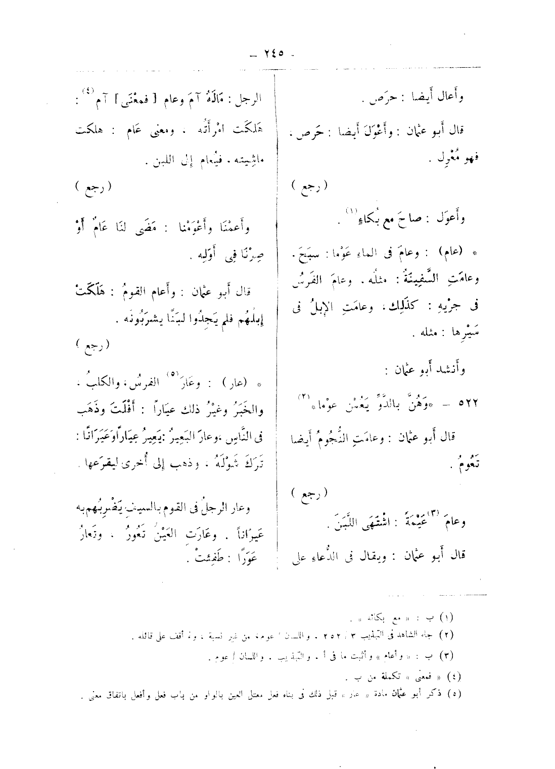 (¬5) ذكر أبو عثمان مادة «عار» قبل ذلك فى بناء فعل معتل العين بالواو من باب فعل وأفعل باتفاق معنى.