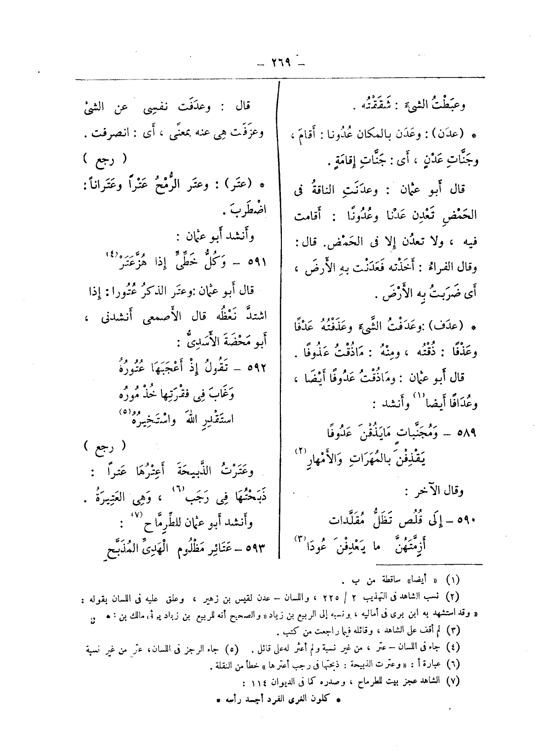 قال: وعدفت نفسى عن الشئ وعزفت هى عنه بمعنى، أى: انصرفت.