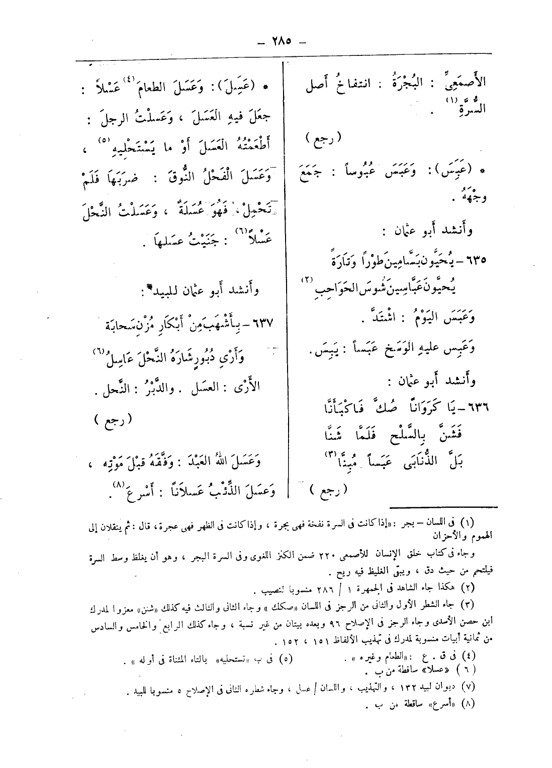 (¬7) ديوان لبيد 132، والتهذيب، واللسان/ عسل، وجاء شطره الثانى فى الإصلاح 5 منسوبا للبيد.