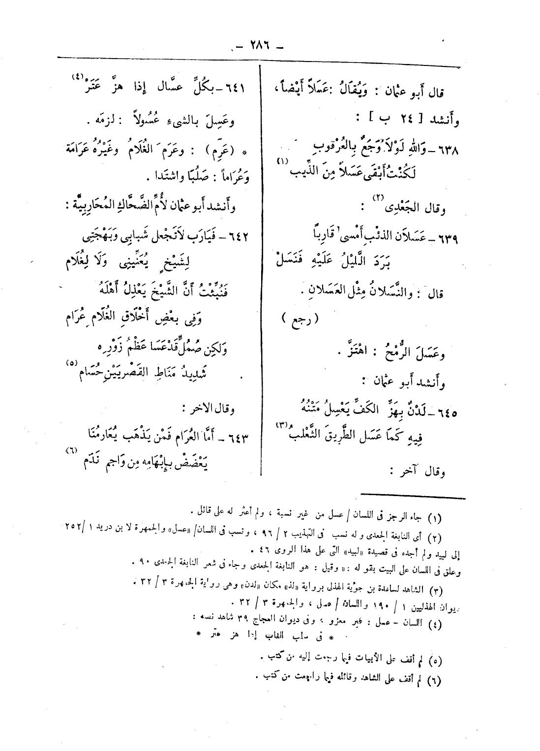 (¬2) أى النابغة الجعدى وله نسب فى التهذيب 2/ 96، ونسب فى اللسان/ «عسل» والجمهرة لابن دريد 1/ 252 إلى لبيد ولم أجده فى قصيدة «لبيد» التى على هذا الروى 46.