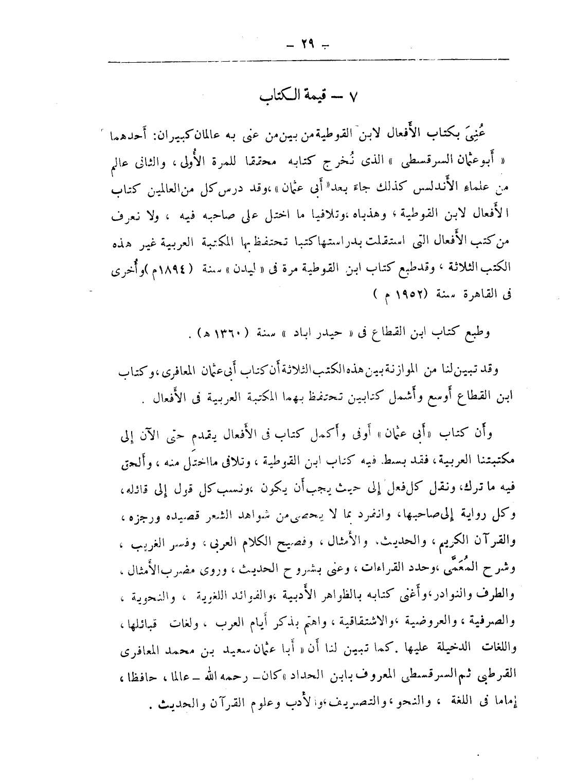 وأن كتاب «أبى عثمان» أوفى وأكمل كتاب فى الأفعال يقدم حتى الآن إلى مكتبتنا العربية، فقد بسط فيه كتاب ابن القوطية، وتلافى ما اختل منه، وألحق فيه ما ترك، ونقل كل فعل إلى حيث يجب أن يكون، ونسب كل قول إلى قائله، وكل رواية إلى صاحبها، وانفرد بما لا يحصى من شواهد الشعر قصيده ورجزه، والقرآن الكريم، والحديث، والأمثال، وفصيح الكلام العربى، وفسر الغريب، وشرح المعمّى، وحدد القراءات، وعنى بشروح الحديث، وروى مضرب الأمثال، والطرف والنوادر، وأغنى كتابه بالظواهر الأدبية، والفوائد اللغوية، والنحوية، والصرفية، والعروضية، والاشتقاقية، واهتم بذكر أيام العرب، ولغات قبائلها، واللغات الدخيلة عليها. كما تبين لنا أن «أبا عثمان سعيد بن محمد المعافرى القرطبى ثم السرقسطى المعروف بابن الحداد» كان - رحمه الله - عالما، حافظا، إماما فى اللغة، والنحو، والتصريف، والأدب وعلوم القرآن والحديث.