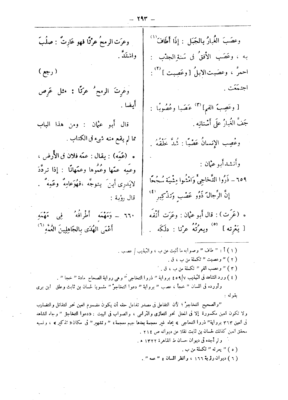والصحيح التخاجؤ؛ لأن التفاعل فى مصدر تفاعل حقه أن يكون مضموم العين نحو التقاتل والتضارب ولا تكون العين مكسورة إلا فى المعتل نحو التعازى والترامى، والصواب فى البيت: «دعوا التخاجؤ وجاء الشاهد فى العين 363 برواية ذروا التحاجى» بحاء غير معجمة بعدها جيم معجمة، وتشهير فى مكان «تذكير»، ونسبه محقق العين كذلك لحسان بن ثابت نقلا عن ديوانه ص 214.